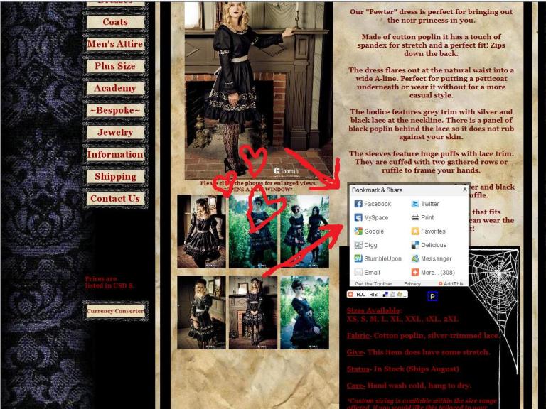 You can use this button to post your favorite items to things like Kaboodle, Facebook, Digg etc. Which in turn gets Gloomth more visits and lets us go on creating awesome clothes and hosting contests!