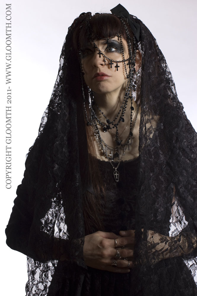 Karen, the talented singer of “Amy’s Arms” agreed to model for our group shoot last weekend! We couldn’t be more excited about the results. The first series we shot with her had a Visual Kei horror feel to it, loads of crosses and chains, and a tattered black lace veil. Decadent and eerie, and she pulls it off perfectly!