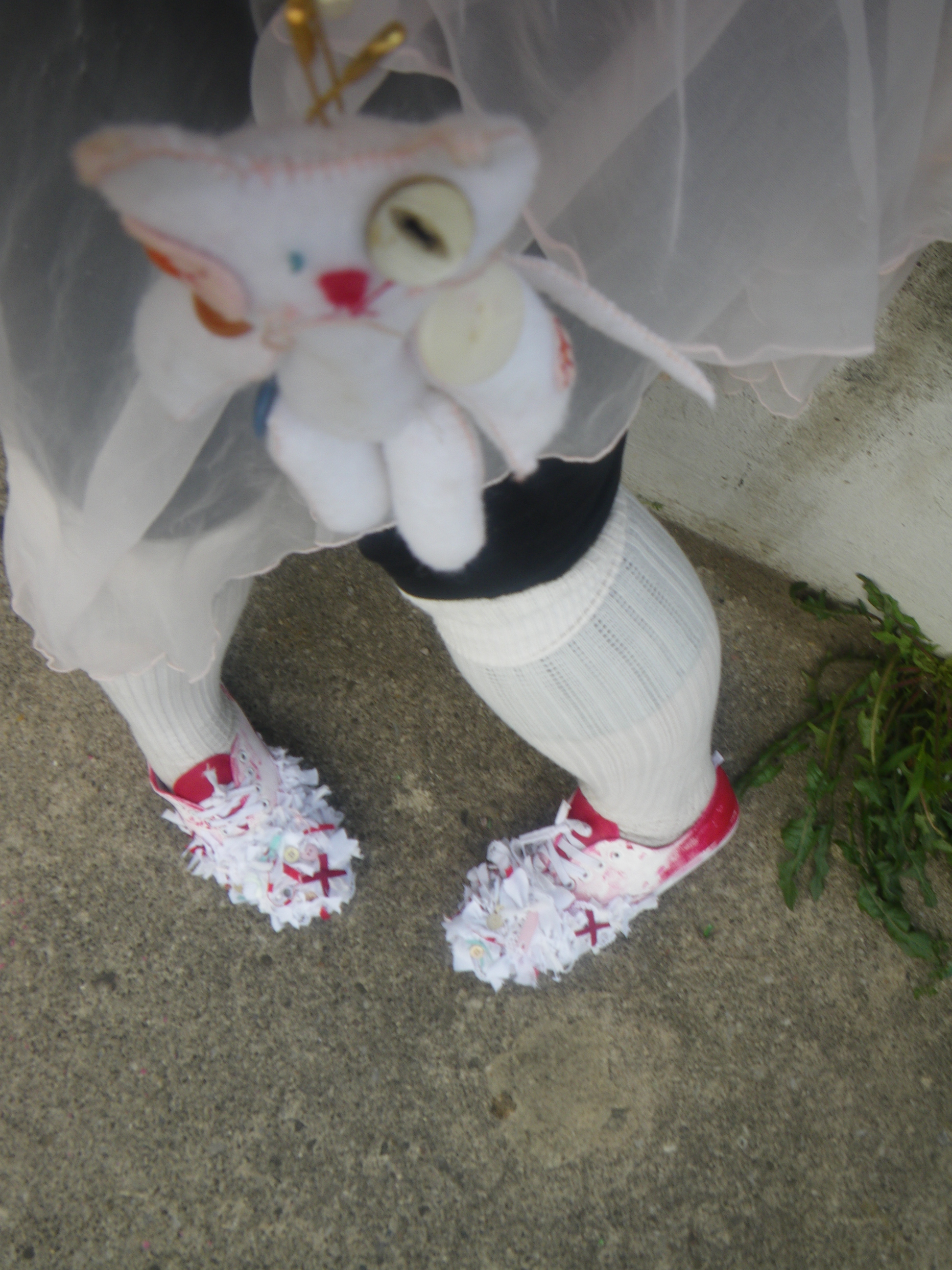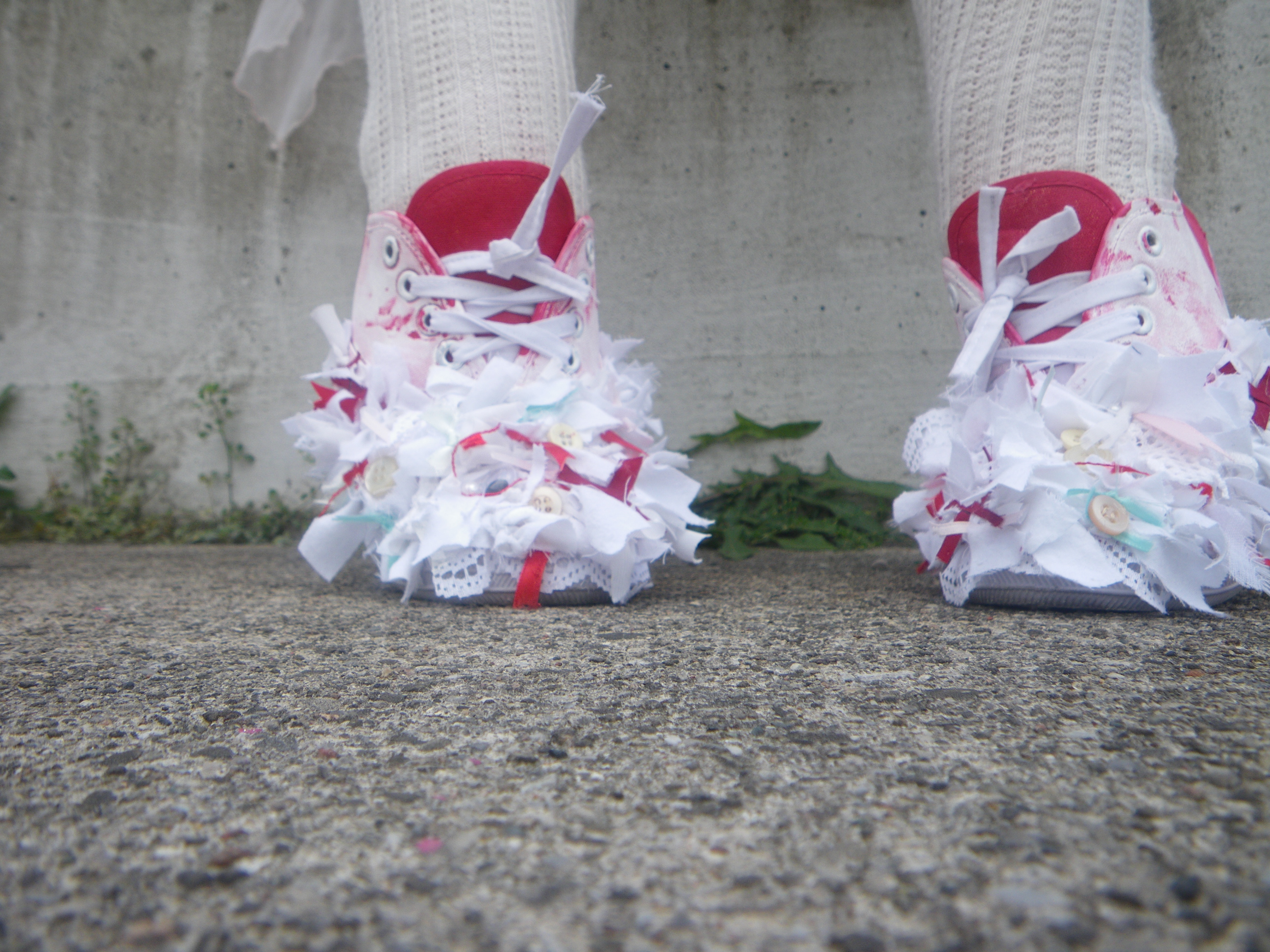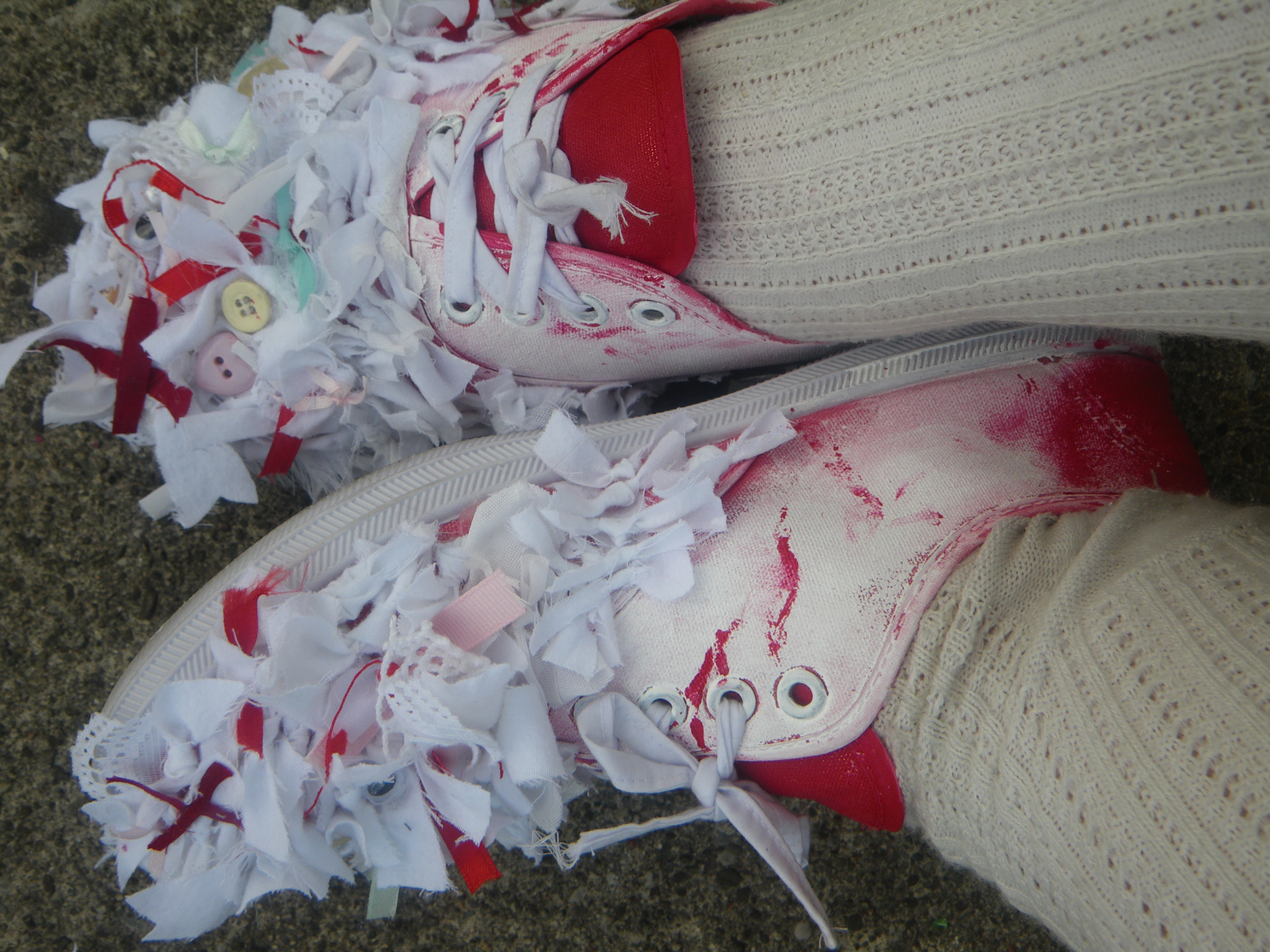 I started by repainting them white, then added blood red streaks and smudges. The front toes are entirely covered in tattered vintage fabrics, red crosses, googly eyes (which I am obsessed with), buttons, bows, and various tangles. All in my white-pastels-blood-red color scheme.