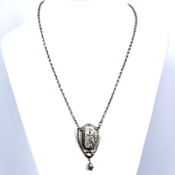Steampunk Antiqued Silver Art Deco Shield Necklace with Rare Thin Vintage Watch by Velvet Mechanism! This is a beautiful and unique steampunk necklace. It features an authentic, rare, thin-rectangular vintage watch securely mounted on a lovely, antiqued silver Art Deco, shield-style mounting and a matching antiqued silver necklace chain. It also has a Swarovski antiqued bronze pearl bead at the bottom. It’s perfect for any feminine steampunk outfit! It is incredibly detailed – I love looking at all the tiny cogs and gears. Plus, this watch still has a few of the original tiny rubies! The watch movement dates from around 1900 to the 1940s and was made by Elba Watch Co. The chain measures about 16″, and the pendant measures about 2″ tall. There’s been some talk recently about the danger of radium (a radioactive material) in some vintage watch parts. I want to assure you that I have tested all of my materials with a Geiger counter, and all of them are NON-radioactive and safe, so you can feel secure buying Velvet Mechanism creations! The necklace comes in a nice black gift box, and will be shipped by Priority Mail right to you!