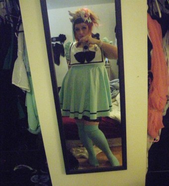Recently I attended the opening for artist Junko Mizuno‘s “Venus Cake” in Toronto, which was totally packed and insane (Tae + crowds = bad). It was a lot of fun anyway! Junko is an amazing artist and was super friendly. Since the theme was food-fetish I decided to wear a bevy of fake baked goods on my head and a custom MINT GREEN version of our “Nautical” dress.