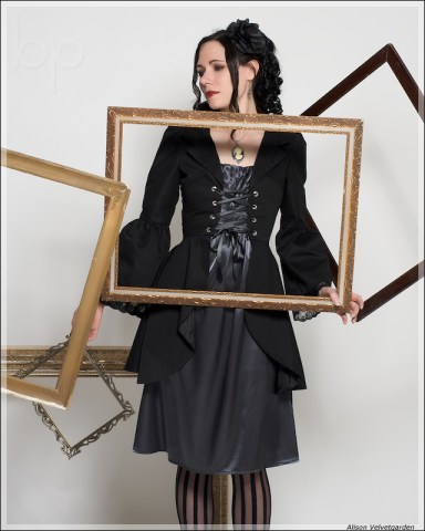 **SOLD! ** ONE OF A KIND- Black Velvet Noir coat! Our beautiful Noir coat made in a lush black velvet instead of cotton twill. Size medium. Bust- 37″, waist 30″.