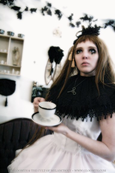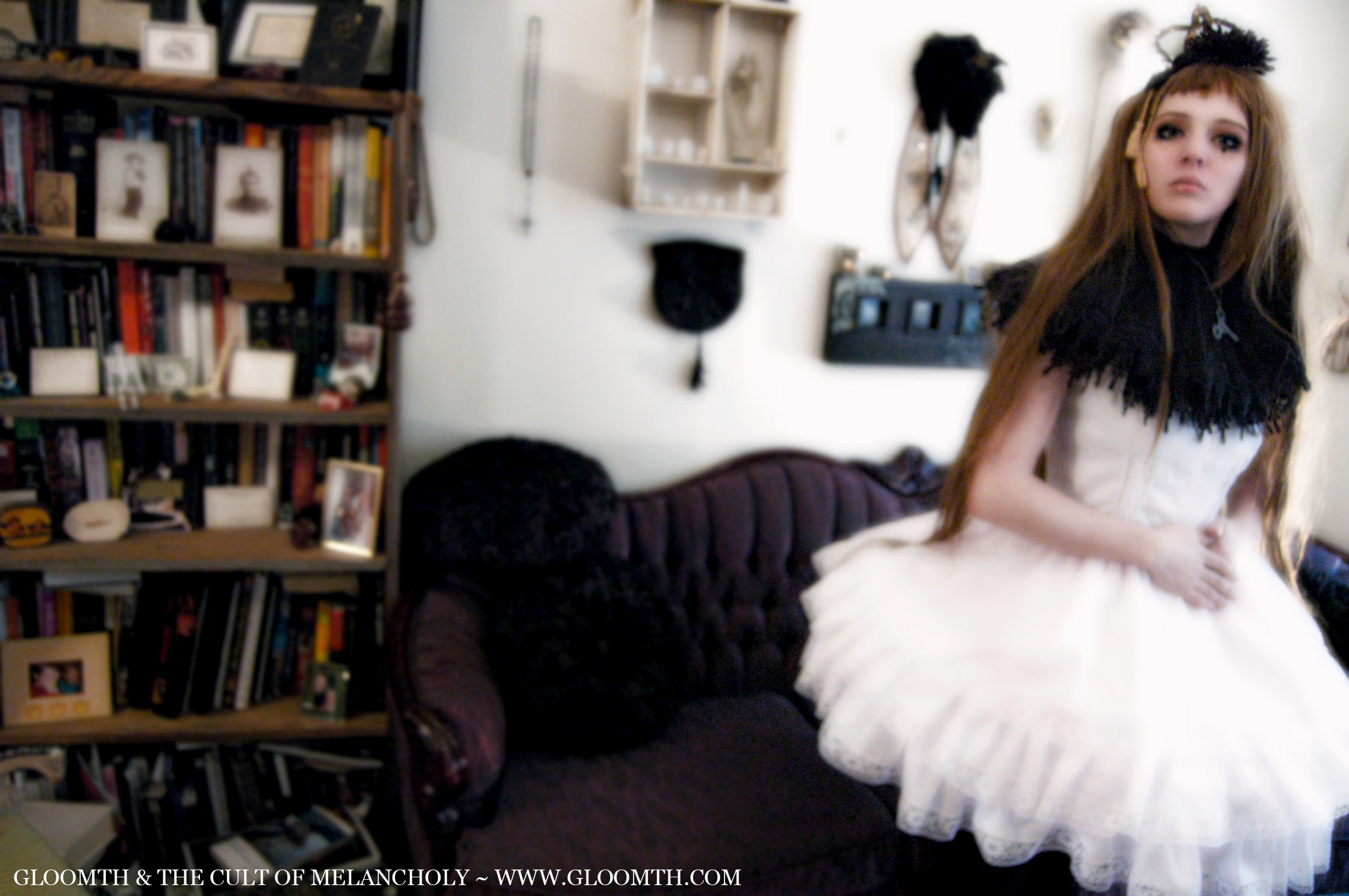 The first series is our “Mechanical Doll” set starring Nymeria. She is wearing our “Apparition” dress in white, as well as a black lace trimmed neck-ruff, and my enormous tangly wig-of-doom!