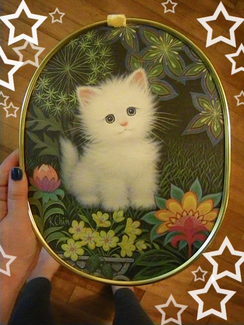 I love tacky décor items from the 1960s-70s, I try not to buy many of them as my apartment could very easily end up resembling my family’s old cottage, but this puffy kitty art was just too good.