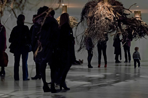 “The spectacular installation by Sicilian artist Giuseppe Licari presents a fanciful network of tree roots, which seem to transform TENT’s central space into a mysterious underworld: the roots project downwards from the ceiling as if the trees are growing above it. The title of the work is ‘Humus’, referring to the soil layer that is essential for the growth of trees and plants, but which is indeed absent here. The relationship between humankind and nature, growth and decay are central themes in Licari’s work, which resonates with an echo of Arte Povera.”