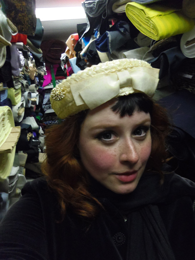 An unflattering shot of my head in the fabric catacombs. I am bright pink from walking in the cold all day! Brr! Yes, a vintage hat goes with everything.