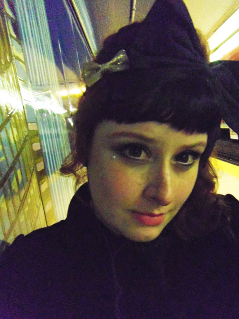 My exhausted head on public transit late at night, decorated with a giant black headbow! 😛