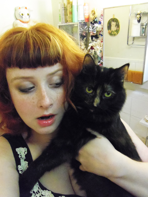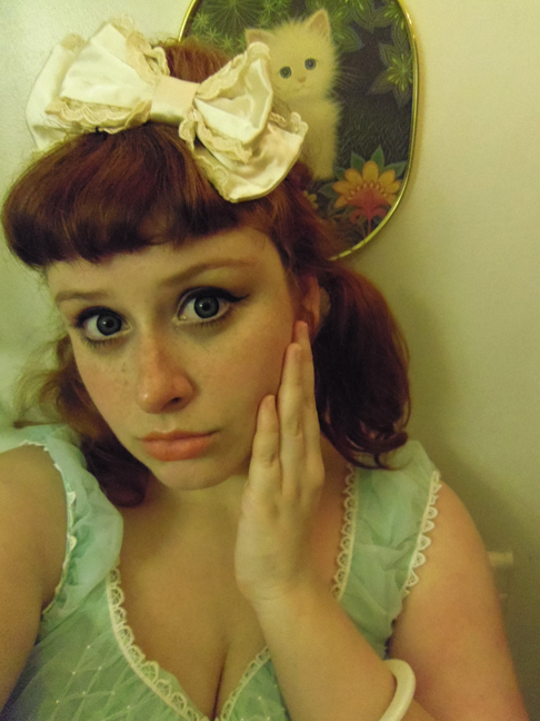The Puffy Kitty and I are practicing our sad-pouting-stares. 😉 Rather interested in sloppy versions of 1960s hair styles right now, which I suppose works well with my panoply of vintage peignoirs/nighties.