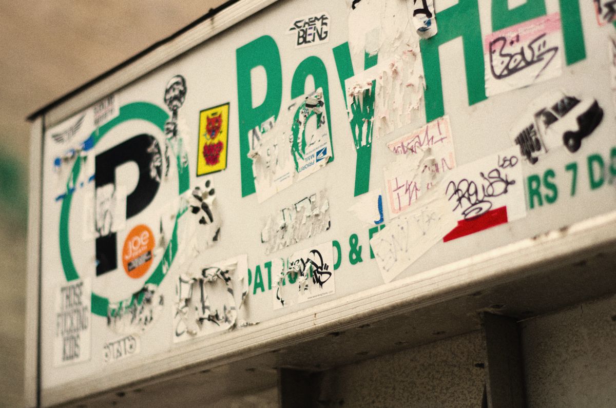 A close up of stickers covering a parking sign.