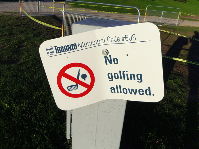 A really specific sign in the park. No golfing. Zero tolerance policy for golf and golf-related activities.