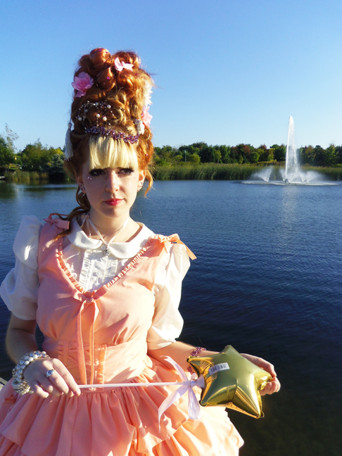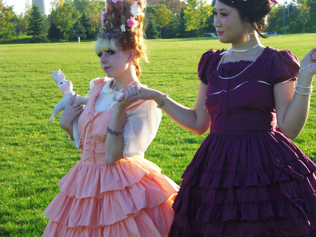 The amazing Savija Ellis created intense hair for this shoot! Enormous towers of shining curls reminiscent of Versailles and Marie Antoinette. Transforming the models into confections of pink and purple! I was very inspired by sugar kei when choosing the accessories and makeup- adding every color coordinating clip and bauble to the hair and a ton of eyelashes.