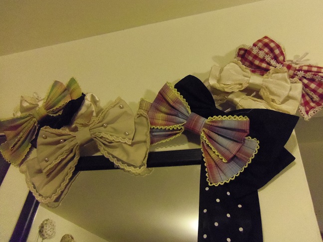 2. Lolita Bows Storage– If you wear lolita you have likely accumulated a small family of bows, they come pinned or clipped to clothing or are something that you buy separately to finish off outfits. They’re big and ungainly, they don’t fit well in drawers and get rumpled stored in boxes. My quick solution to this problem was to hang them up! You could easily vary this technique with different ribbon/string or how you place the arrangement in your space. 🙂