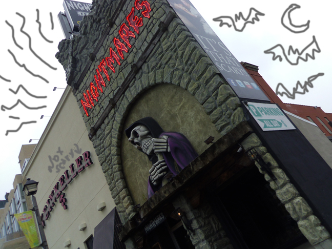 Our first destination was the famous “Nightmare’s Fear Factory” which is the haunted house where they take your picture when you scream! Maybe you’ve seen the photos online of people freaking out against a damask wallpaper? Yeah, that’s the place. At one point during our tour of the pitch black haunted house I thought I was holding my friend’s hand and she kept trying to pull away, apparently I had been dragging one of the monster actors along with us thinking it was her- woops! 😛