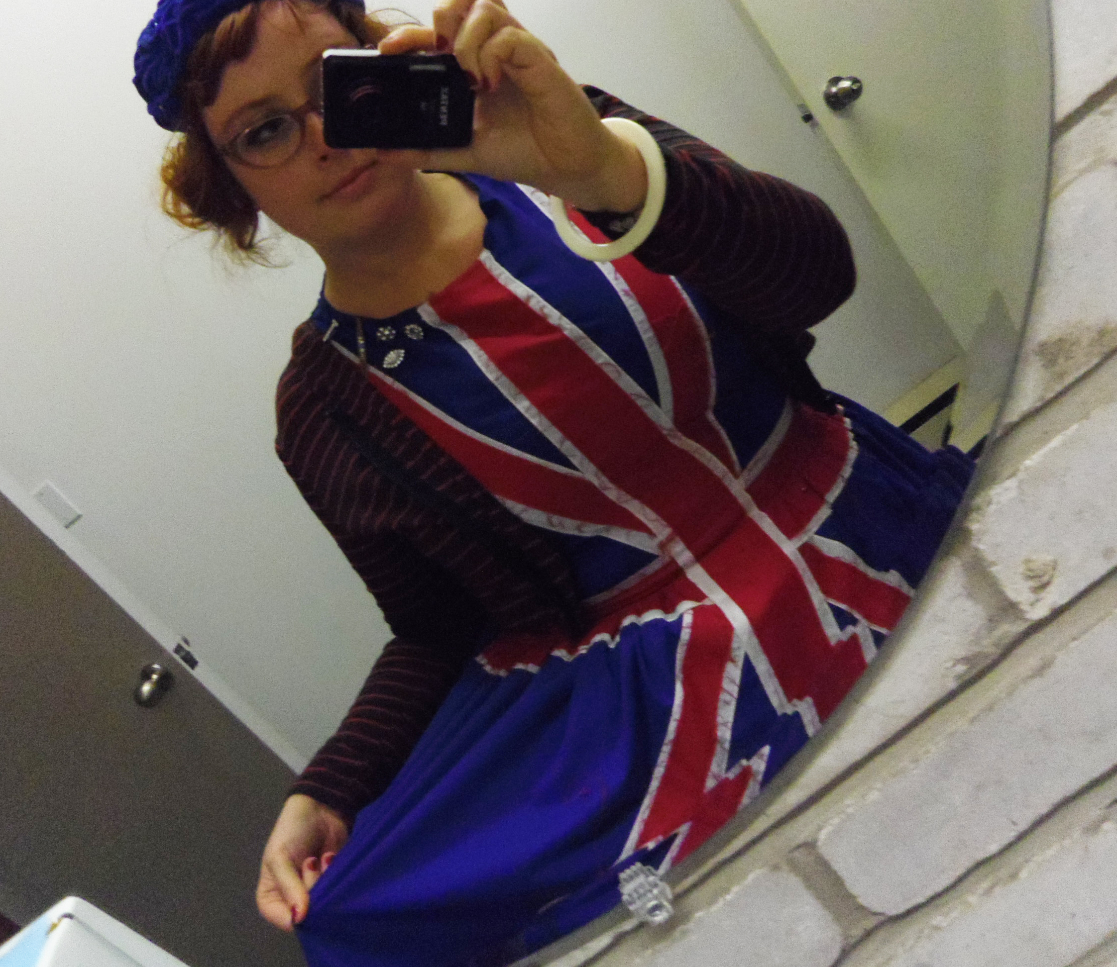 On another rainy day I wore Gloomth’s “Union Jack” dress with a discontinued Gloomth hoodie and a vintage blue hat. Another wretched rain-hair day. 😦