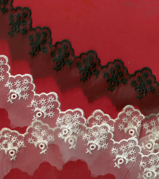 After much sample ordering I finally decided on this lovely scalloped sheer eyelet lace! It feels silky and rich and has pretty embroidered details. We have it in ivory, white, and black and will be using it on all of our designs that incorporate lace trim!