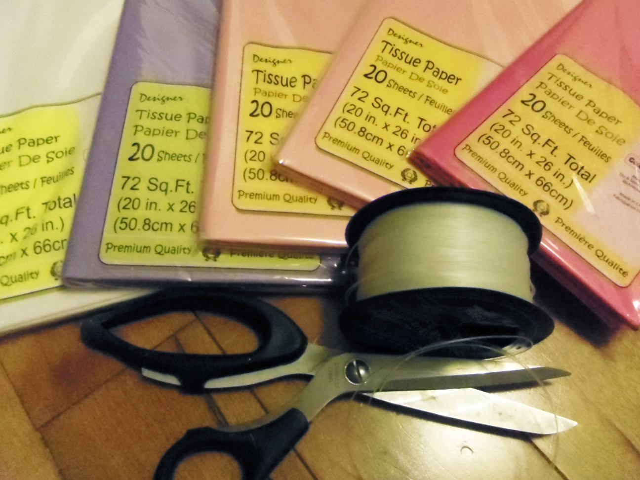 -Tissue Paper: Most dollar shops have packets with 20 sheets in them, you can get 2 big flowers or 4 little flowers out of those packs. Around Halloween you can get some really neat themed tissue papers!