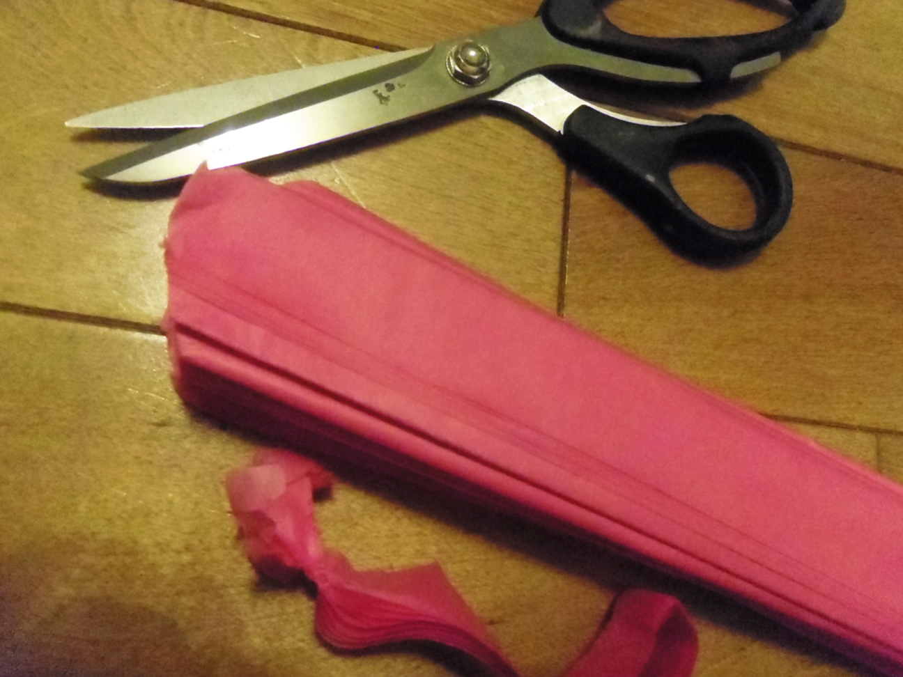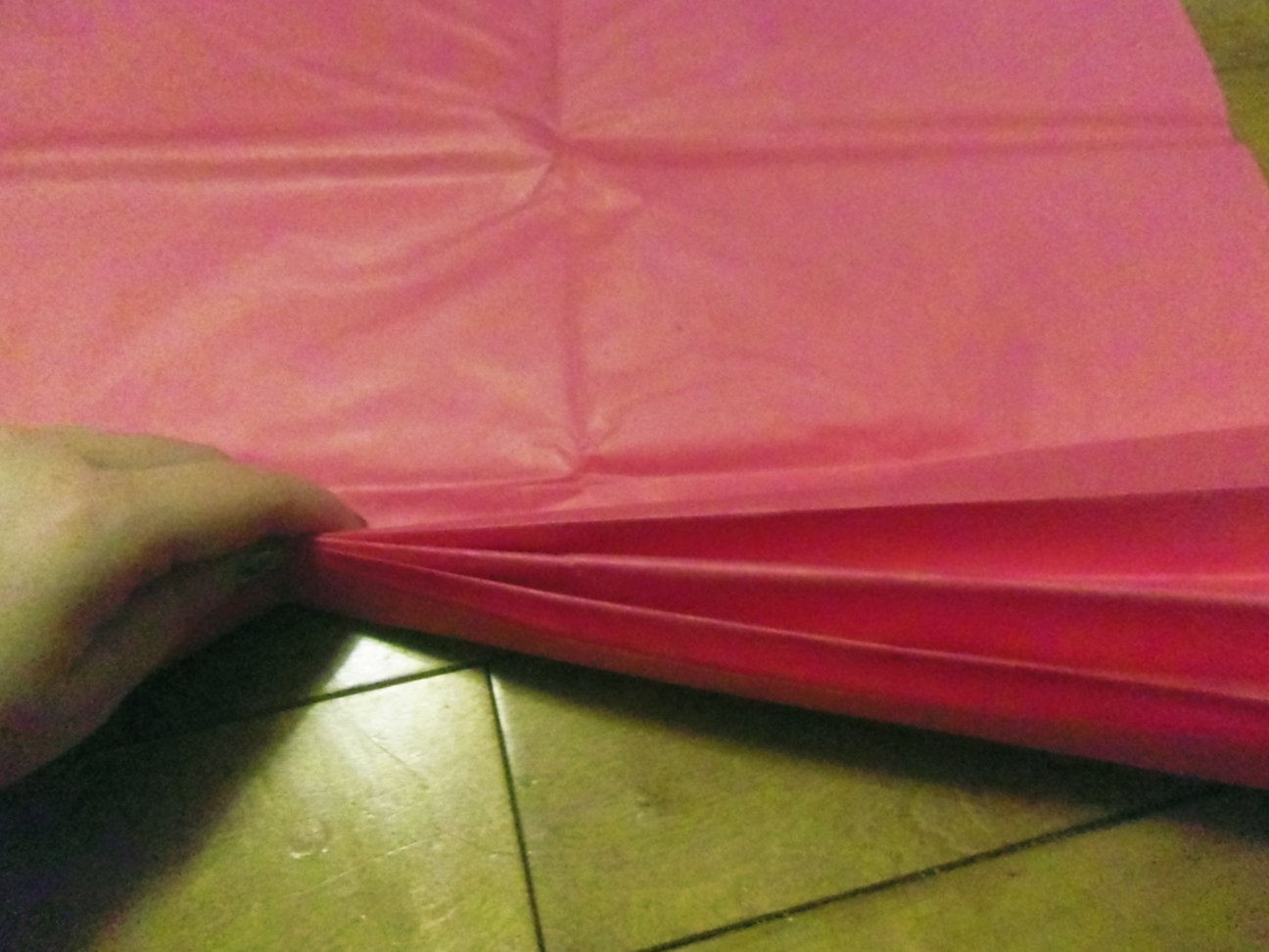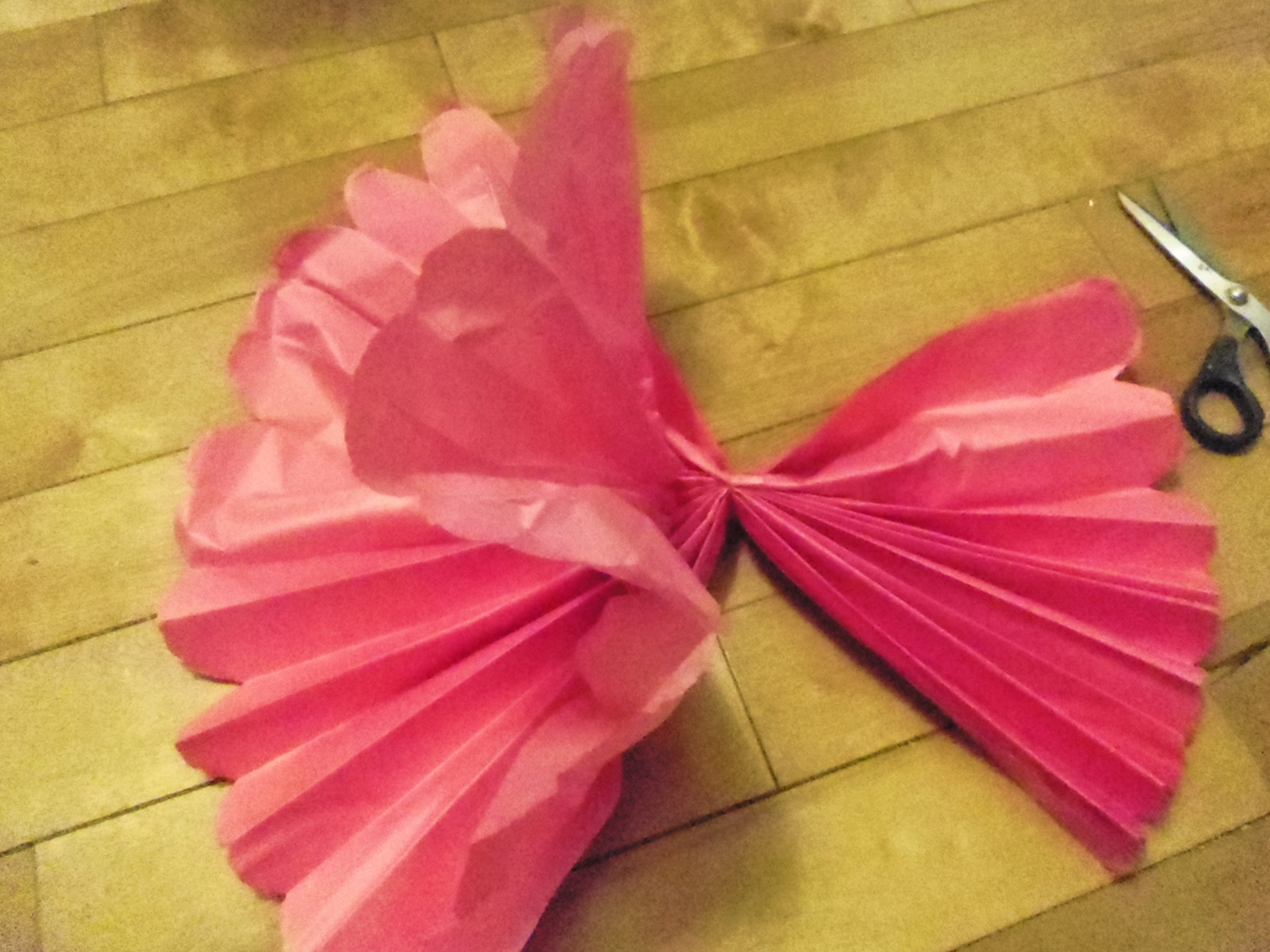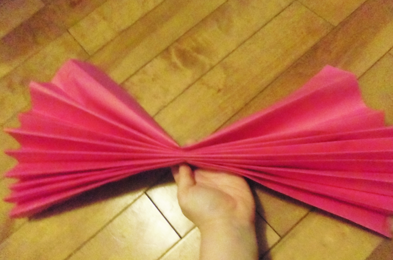 Fold up the tissue paper starting from the bottom. You’re going to fold it in accordion style (over and then under) in about 1″ wide folds. When you’re done it’ll look like a weird foldy bow tie or fan (second photo above).