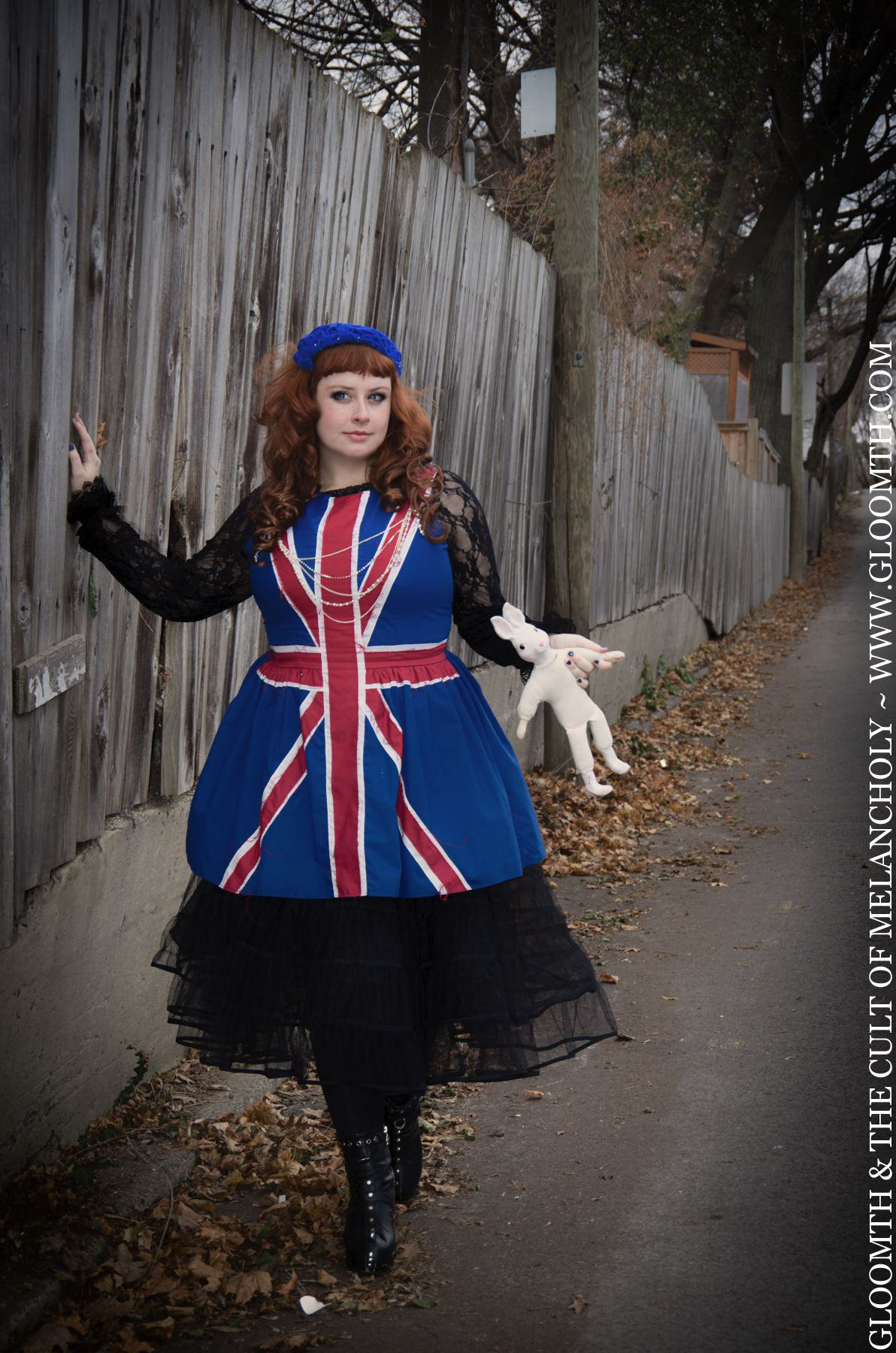 Our “Union Jack” dress is one of my favorite pieces from the catalogue! The possibilities for coordinating it are endless. I like to wear it with boots and a cardigan (with a ton of vintage buttons on it) for a casual day look. For this quick photoshoot I coordinated it in a slightly more fancy way!