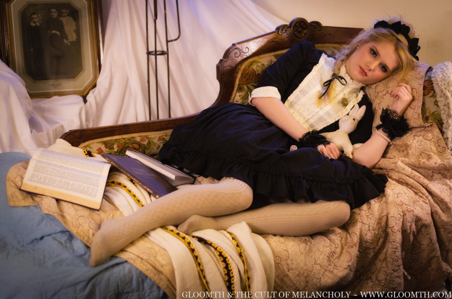 Grab your teddy bear and a pillow and come spend a lazy afternoon with us in our recent “Sleepy Sunday” photoshoot. Gloomth Girl Poppy models our redesign of our “Amaryllis” skirt and “Odette” dress. Photos by Russel Hall.