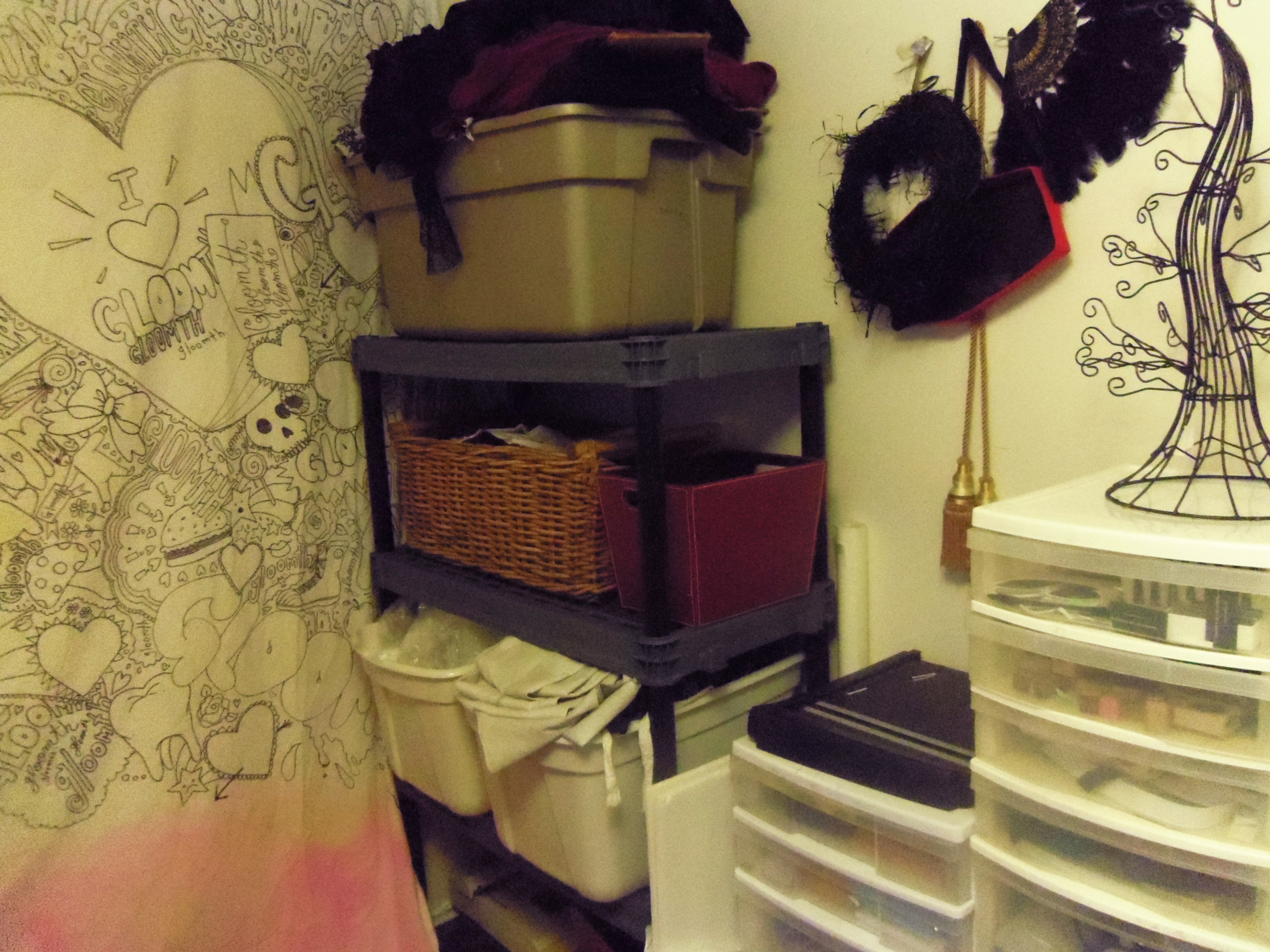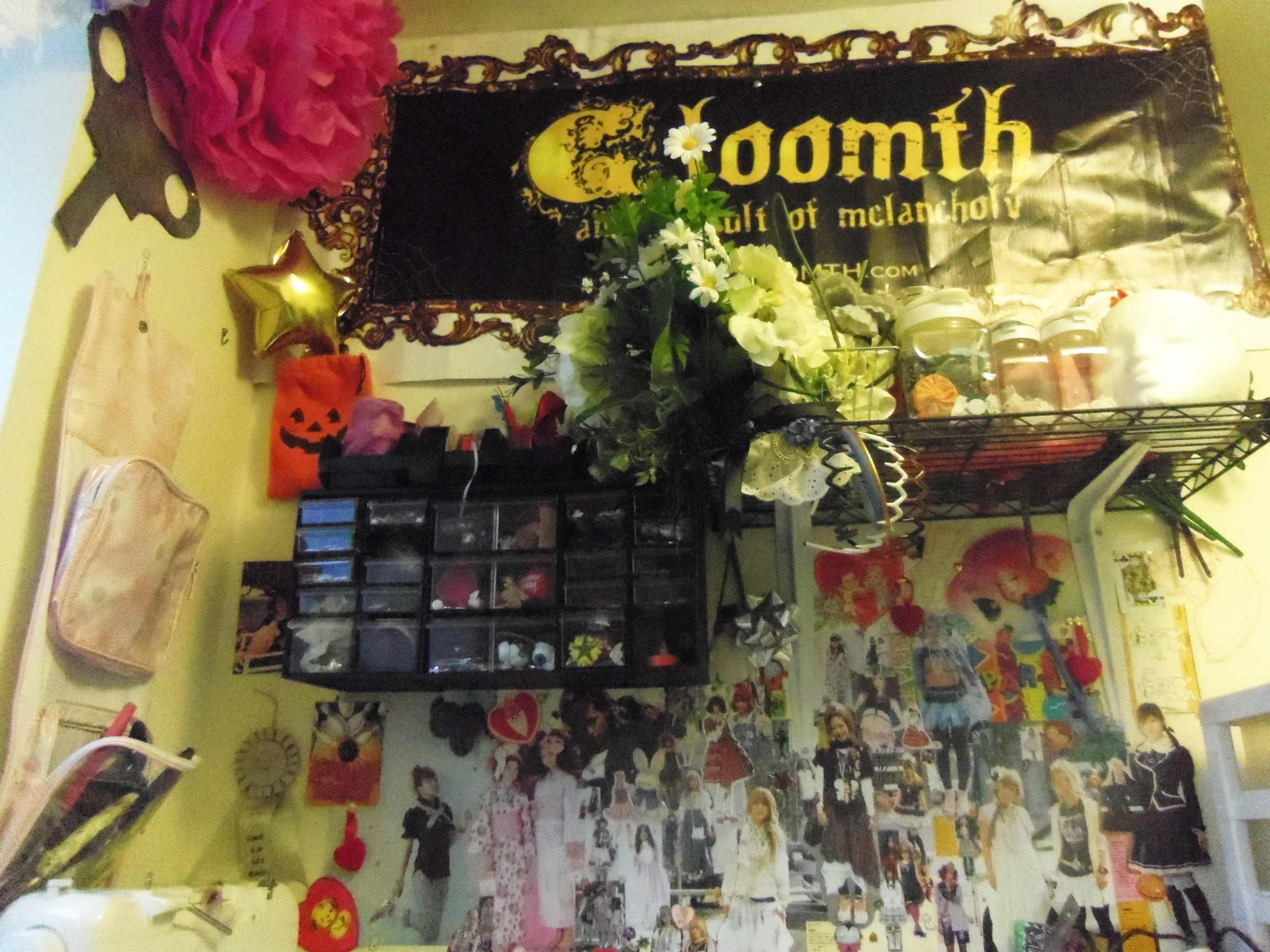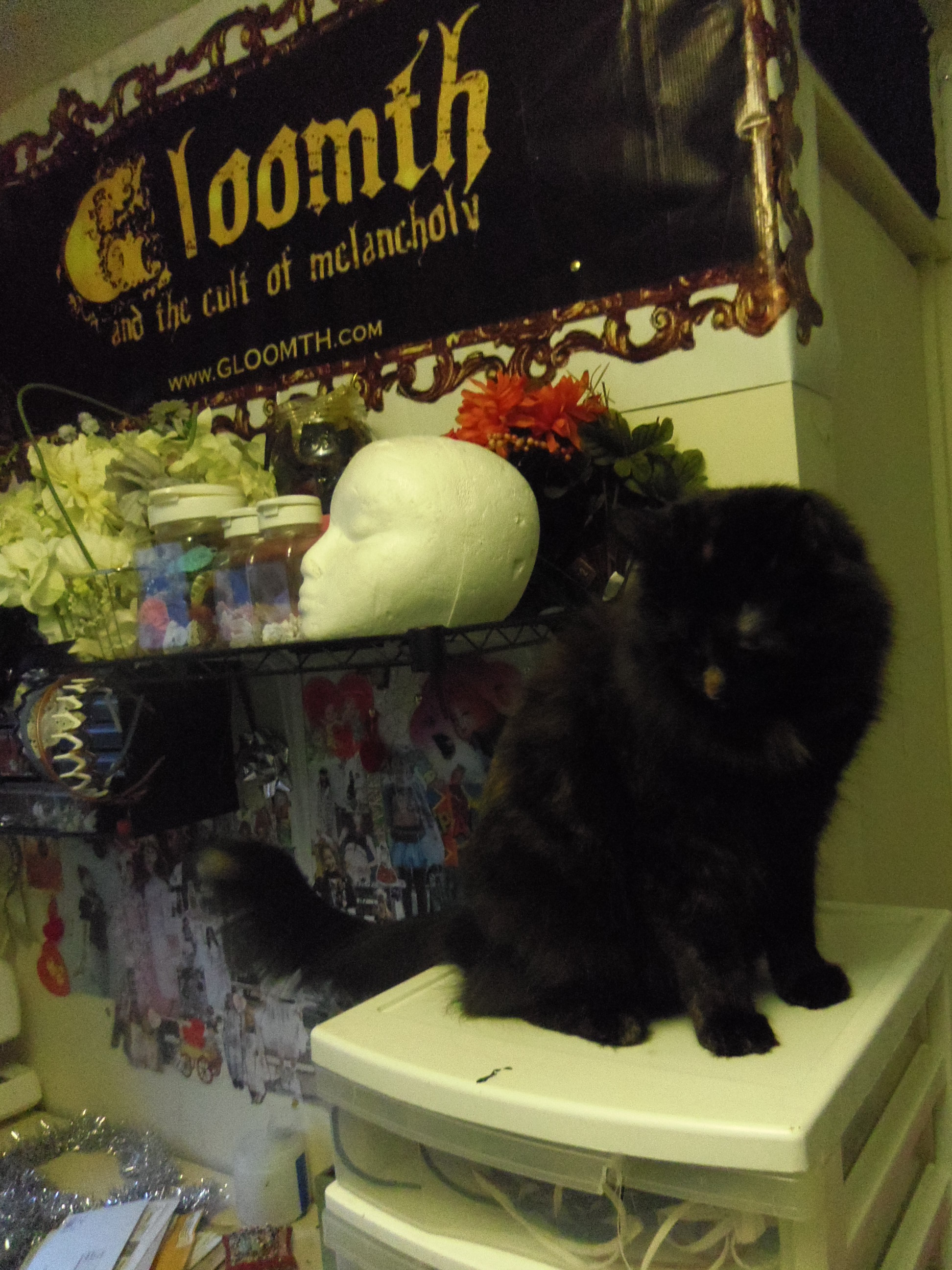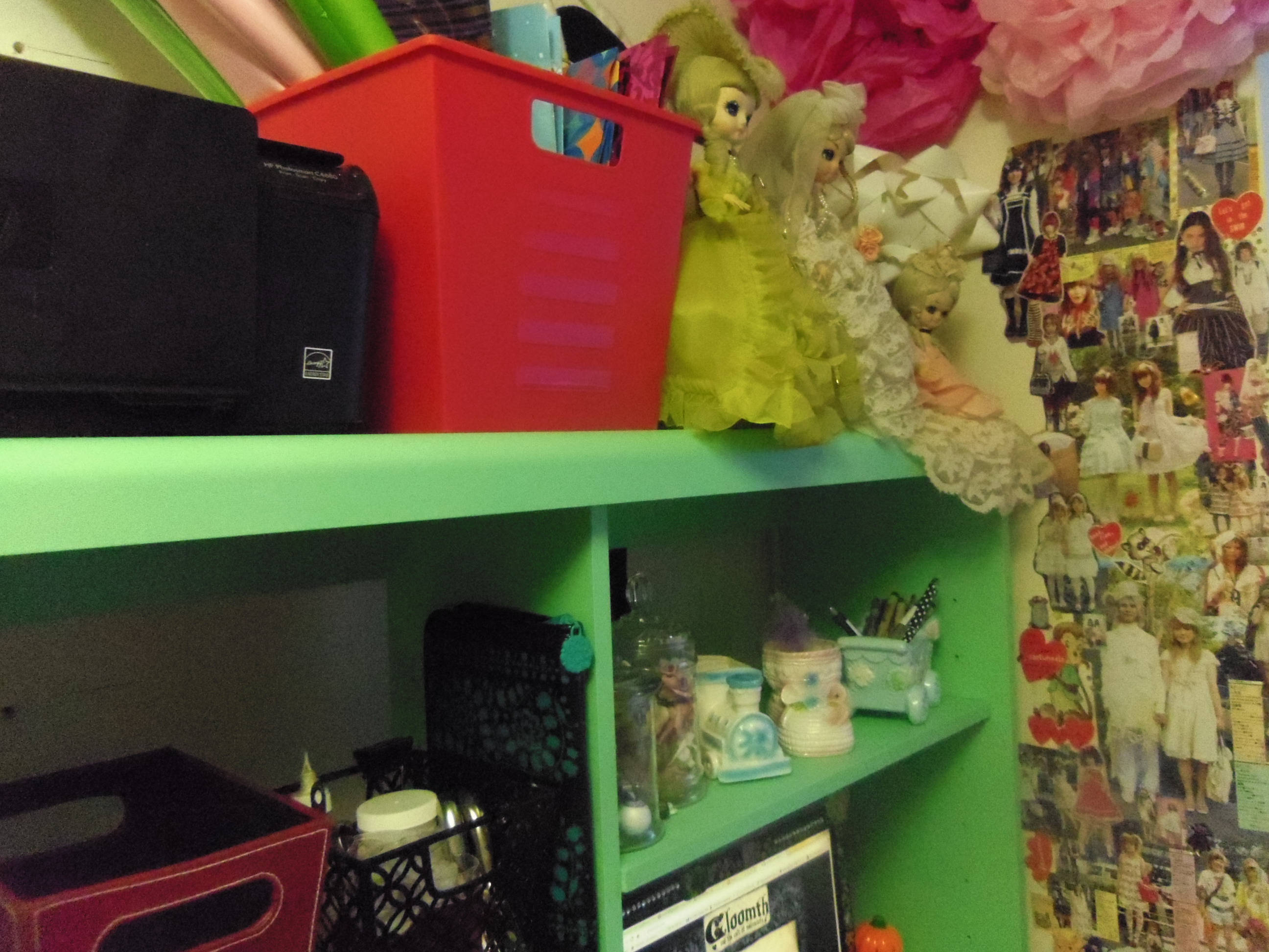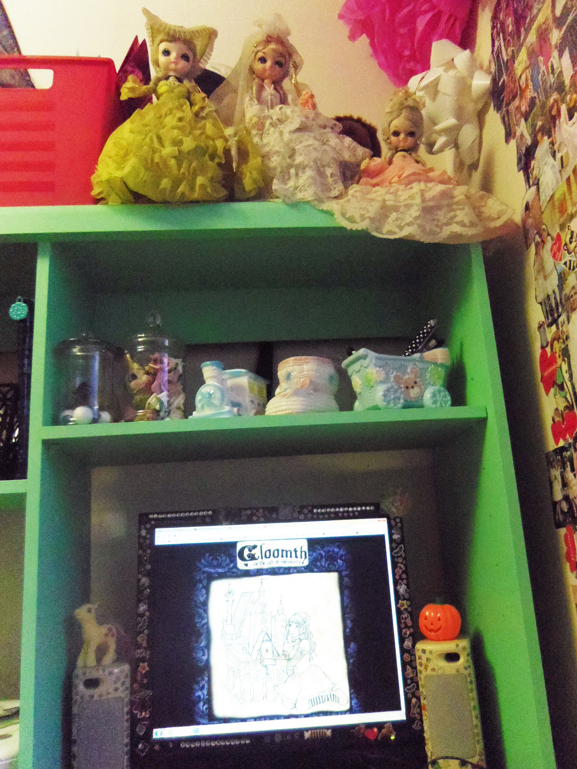 I got fed up and attacked! Dumped out every drawer, sorted every corner, and shredded an appalling amount of out-dated paperwork. I repainted my ugly laminate desk hutch (not the desk half as it needs replacing, thanks jerk movers for breaking it, btw) and mailing table a bright, saturated mint green! Plastered the walls near my computer and work table with street fashion snaps, vintage 1960s Valentines, and Halloween stickers (as I also work on the Tarot Deck there and other illustration projects, it’ll be helpful to have the inspiration). Hung up our Candy Prom Party backdrop to hide the fuse panel and put my creepy vintage Bradley dolls above my computer. And generally turned it into my ideal little work space! 😀