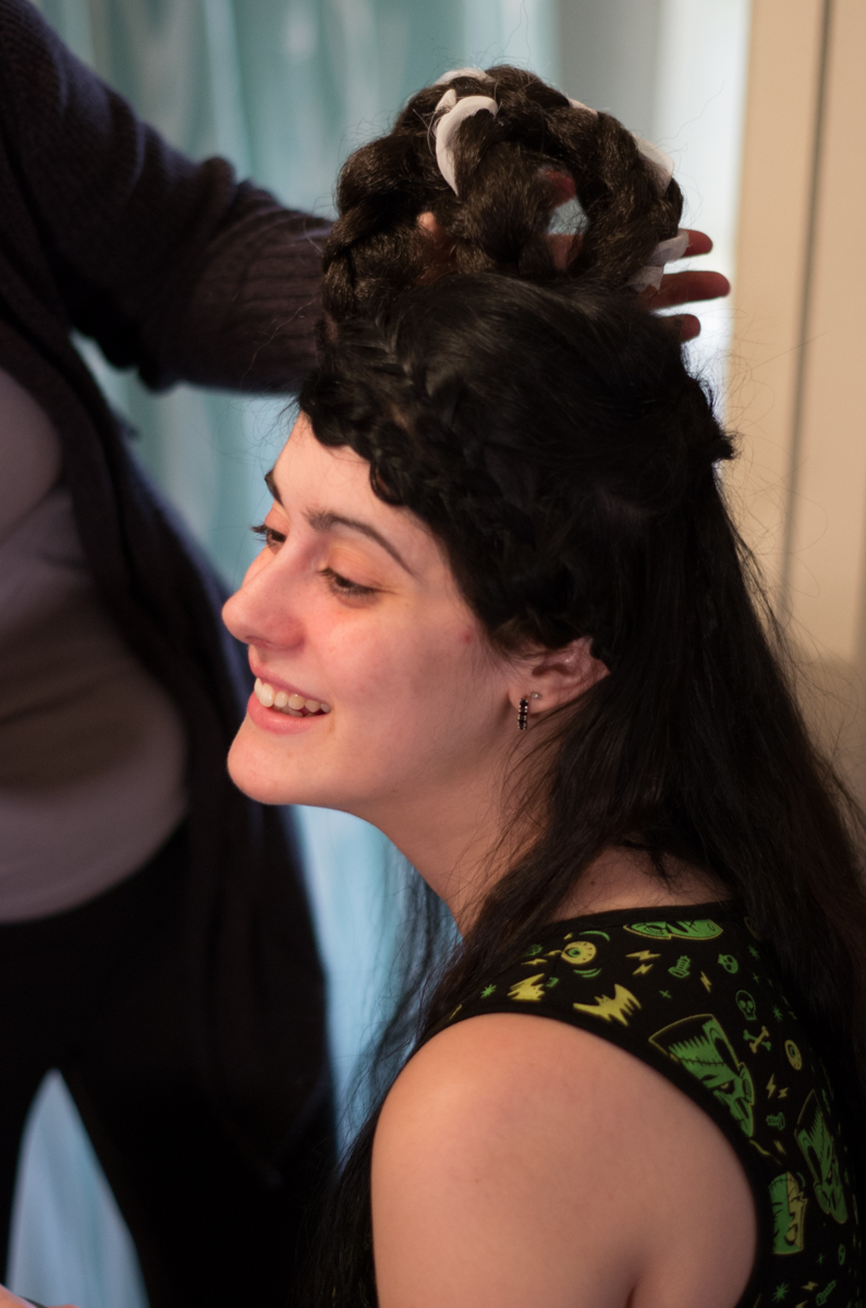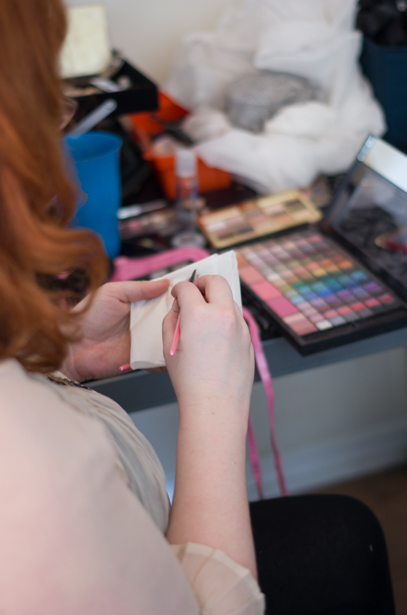 Last minute lipstick touch ups and wardrobe details. Me hunched on the floor pinning bows to Syringe’s socks. (The tattoo is from Lord of the Rings and very old).