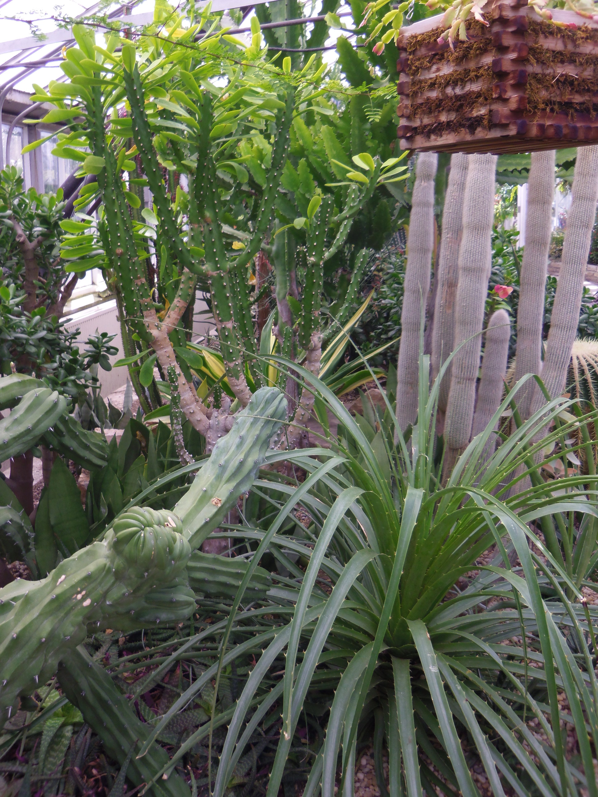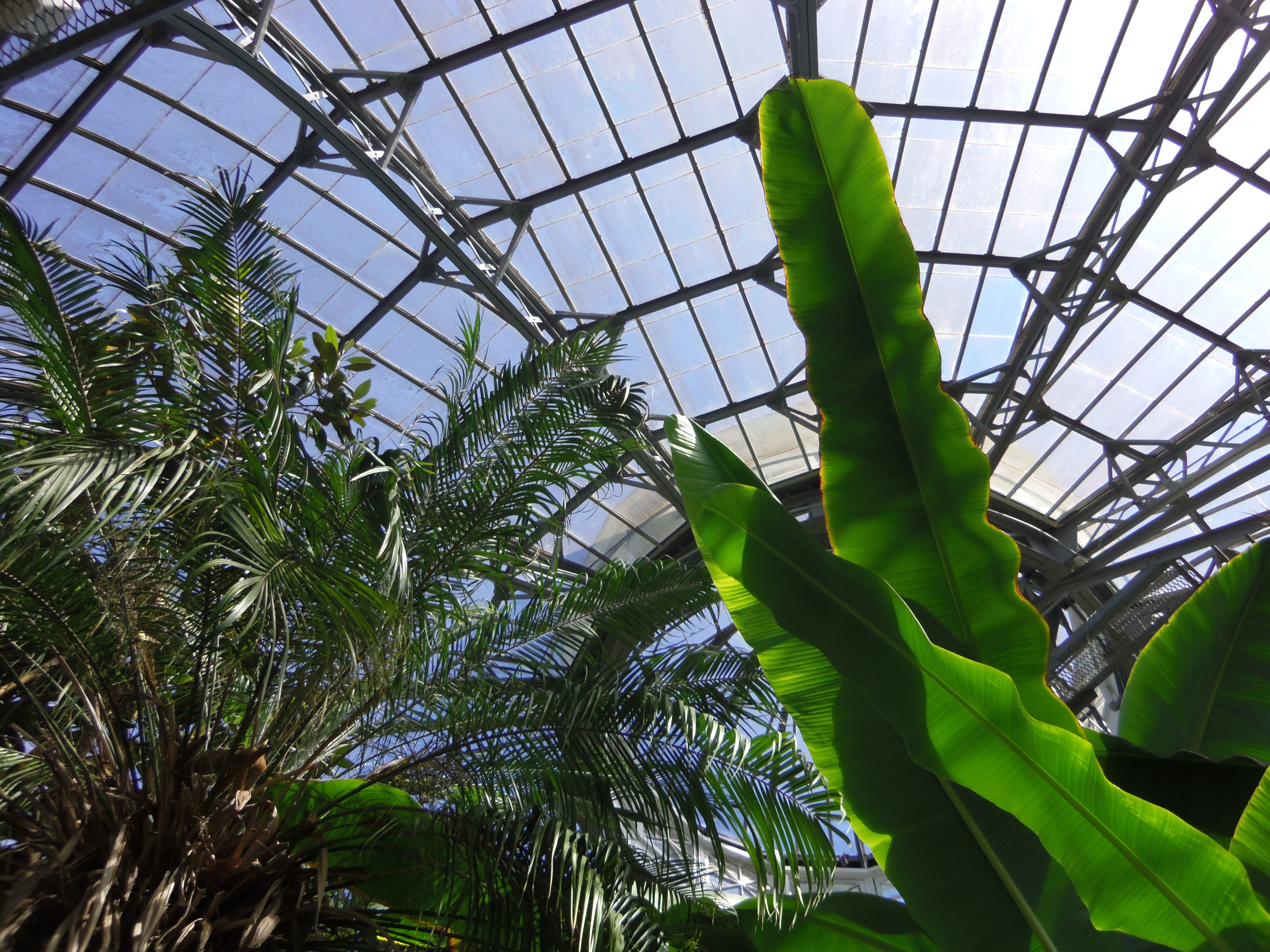 It’s a lovely conservatory, and quite extensive inside. The main room has an incredible glass ceiling and is full of light. In this space grow various palm trees and hot-weather plants.