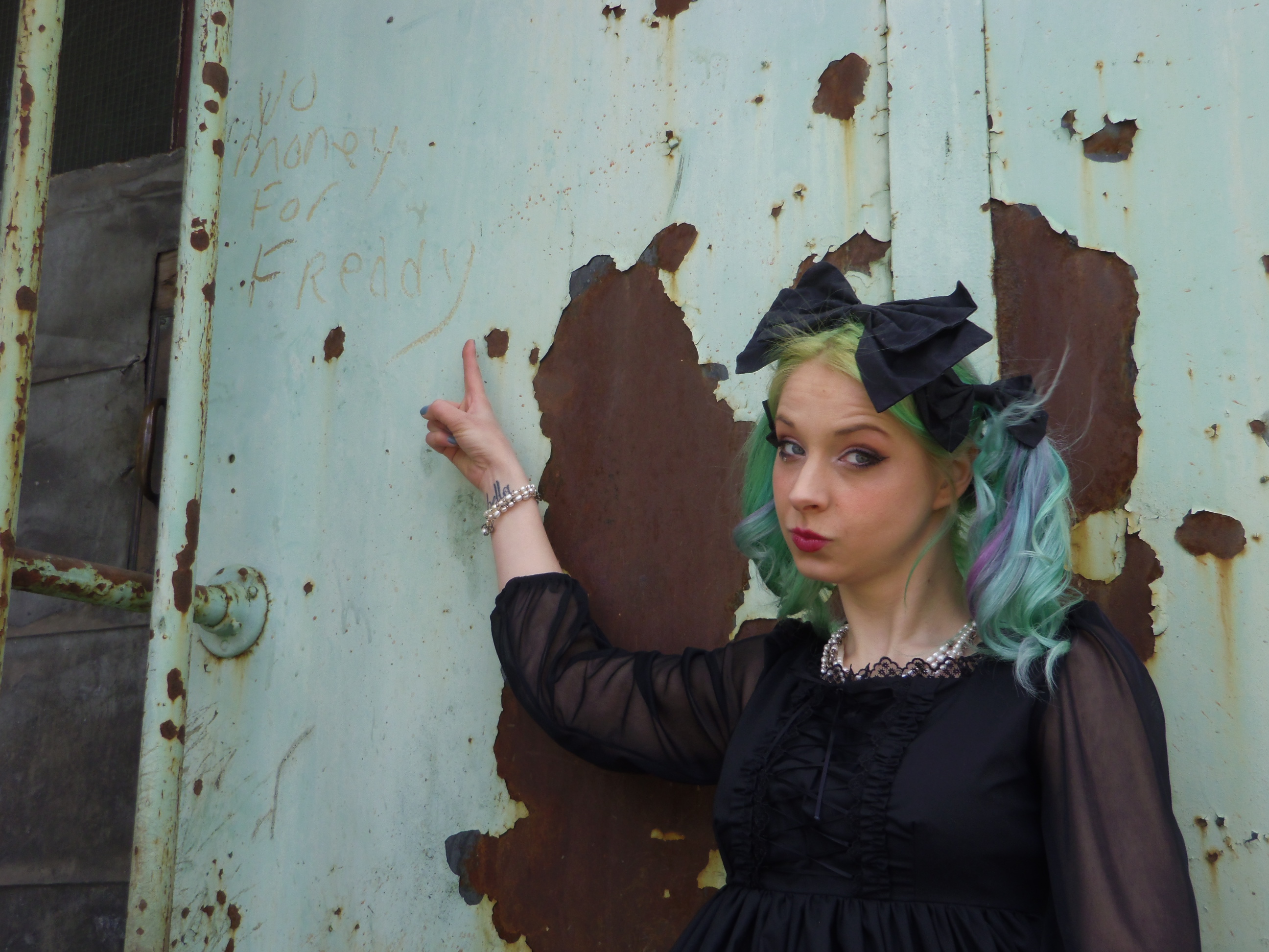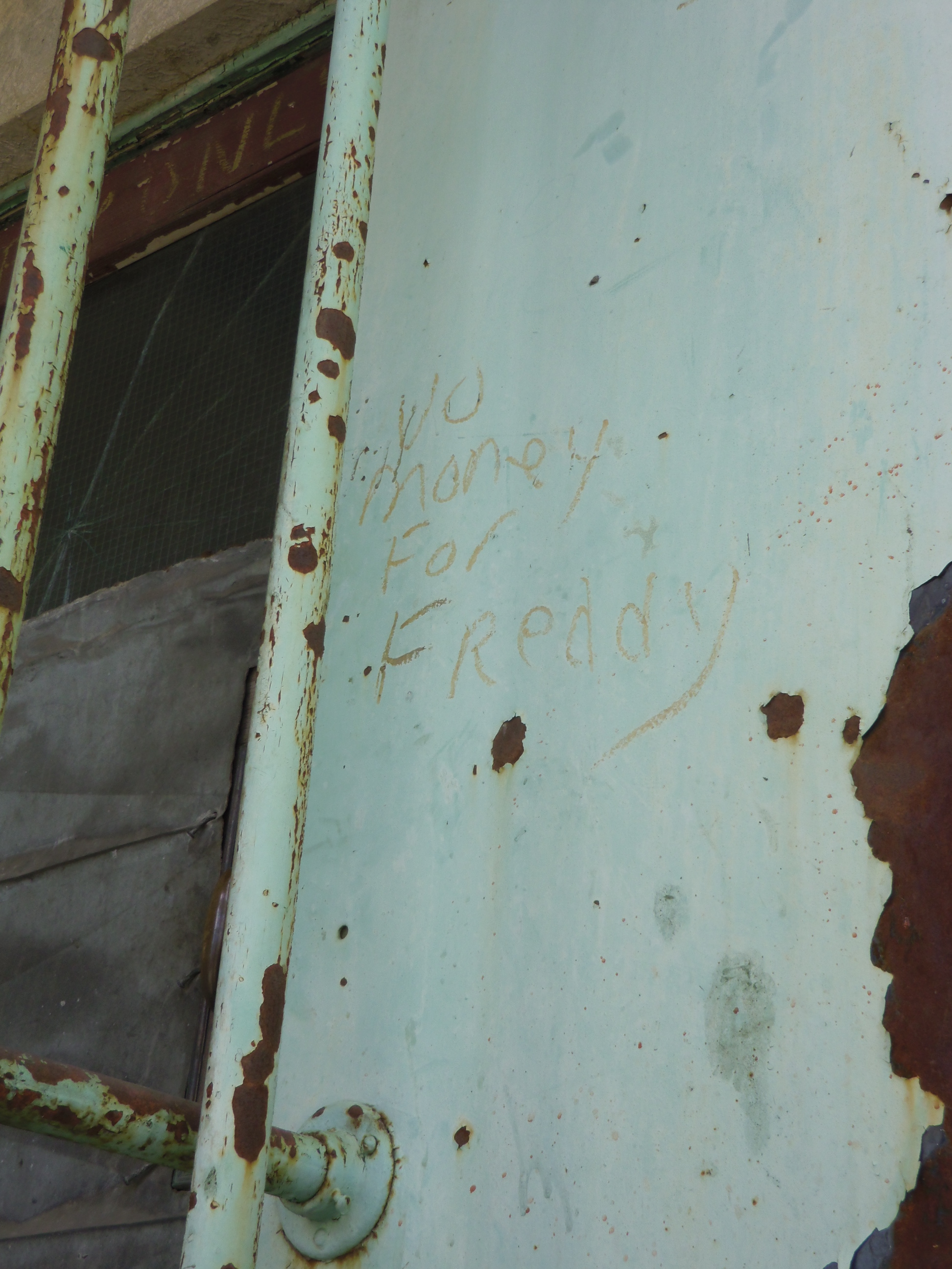 Apart from “Visitor Parking” there were no other signs on the minty old building, however someone had scrawled “No Money For Freddy” on it in reddish crayon/pencil by the door. So weird.