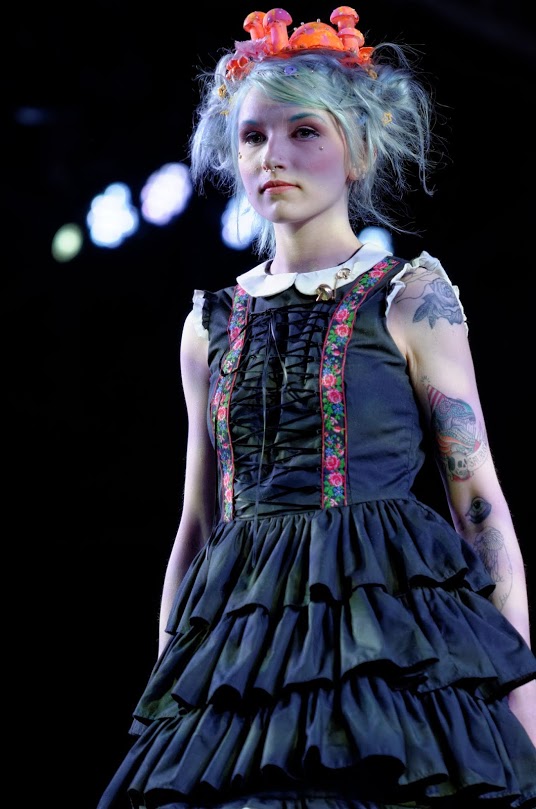 Syringe wore our “Folk” dress with a headdress consisting of neon mushrooms! Lady Rakasha, who also did the makeup for our show, wore our “Victoria” dress in a classical outfit.