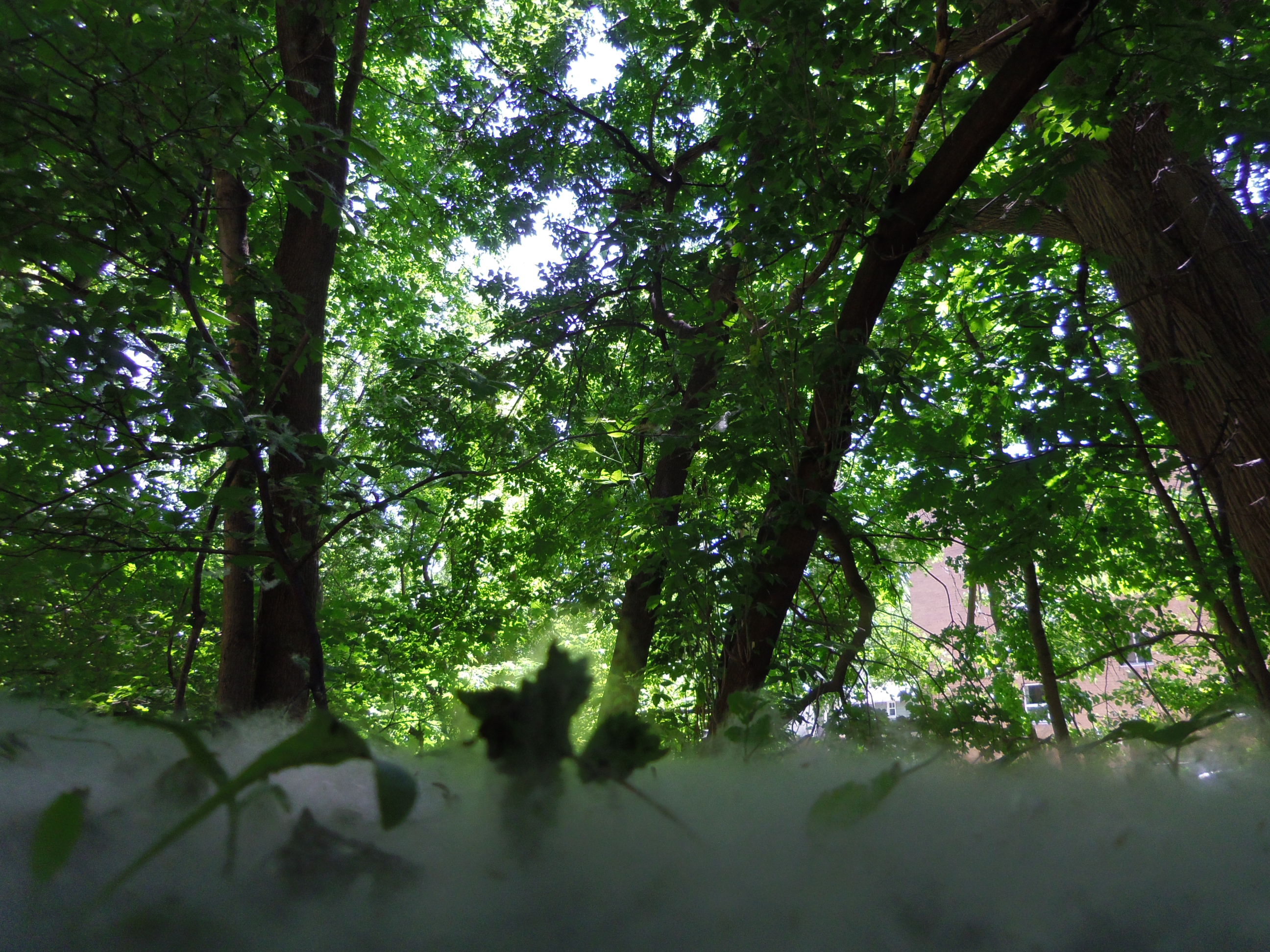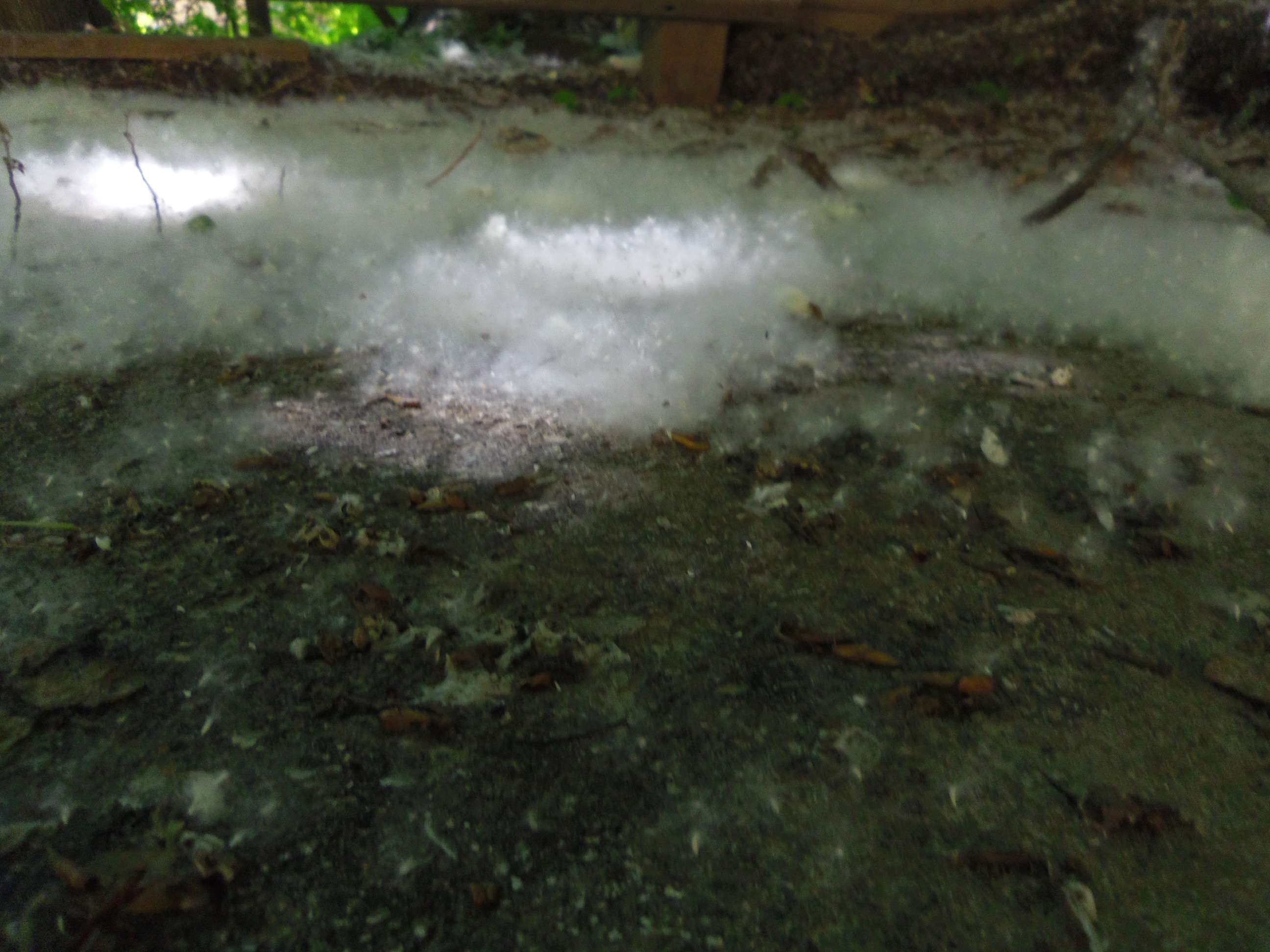 The fluff gathers on peoples’ lawns, piling in corners like snow. There is so much of it! In some places it’s about 5 inches thick on the ground.