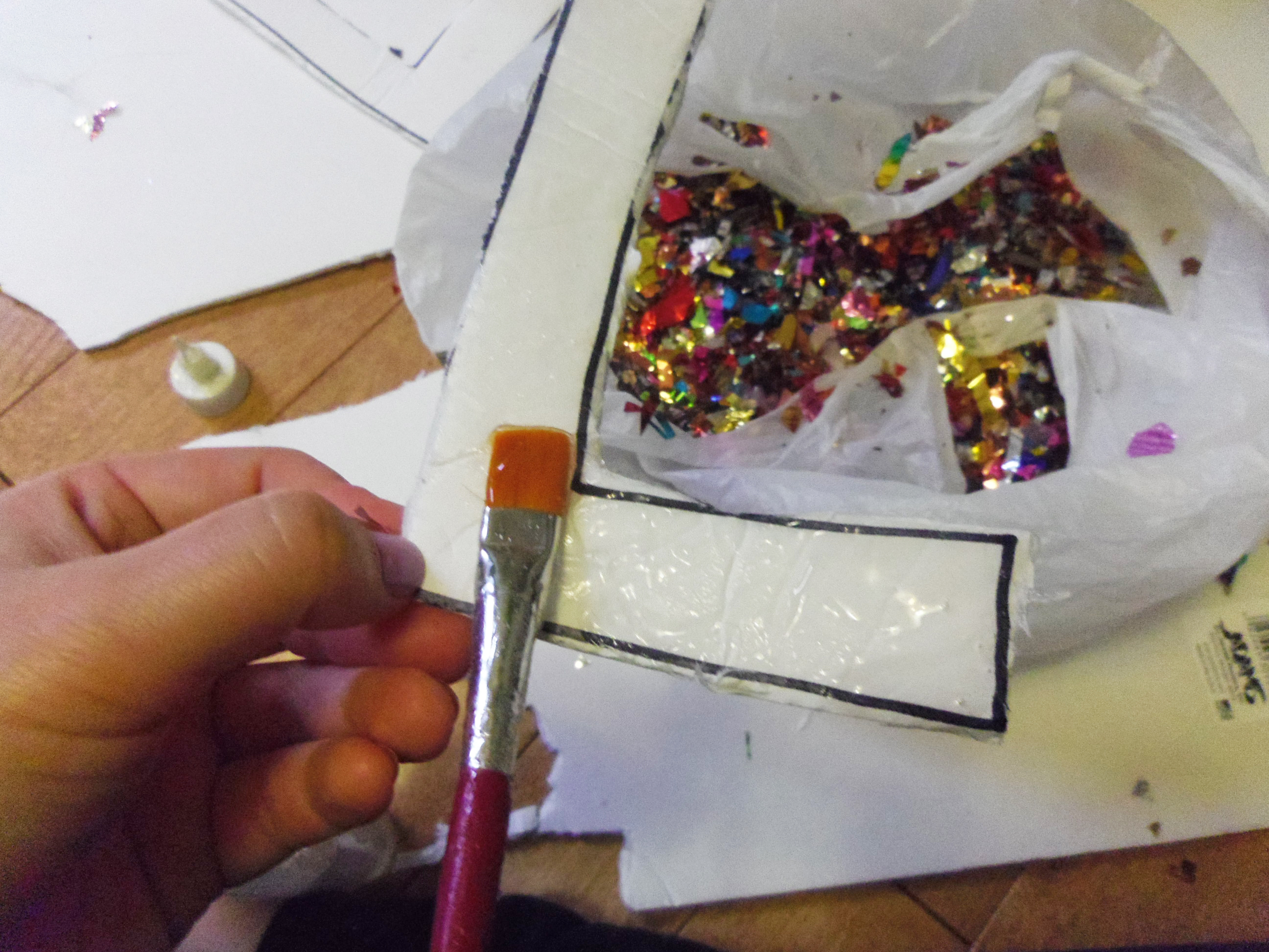 I poured my confetti into a shopping bag to reduce mess, I definitely recommend doing that or else it gets everywhere. Now lay the letter glue side down into your confetti or glitter and gently press it down. Carefully lift the letter out of the confetti and make sure all the foam core is covered in confetti!