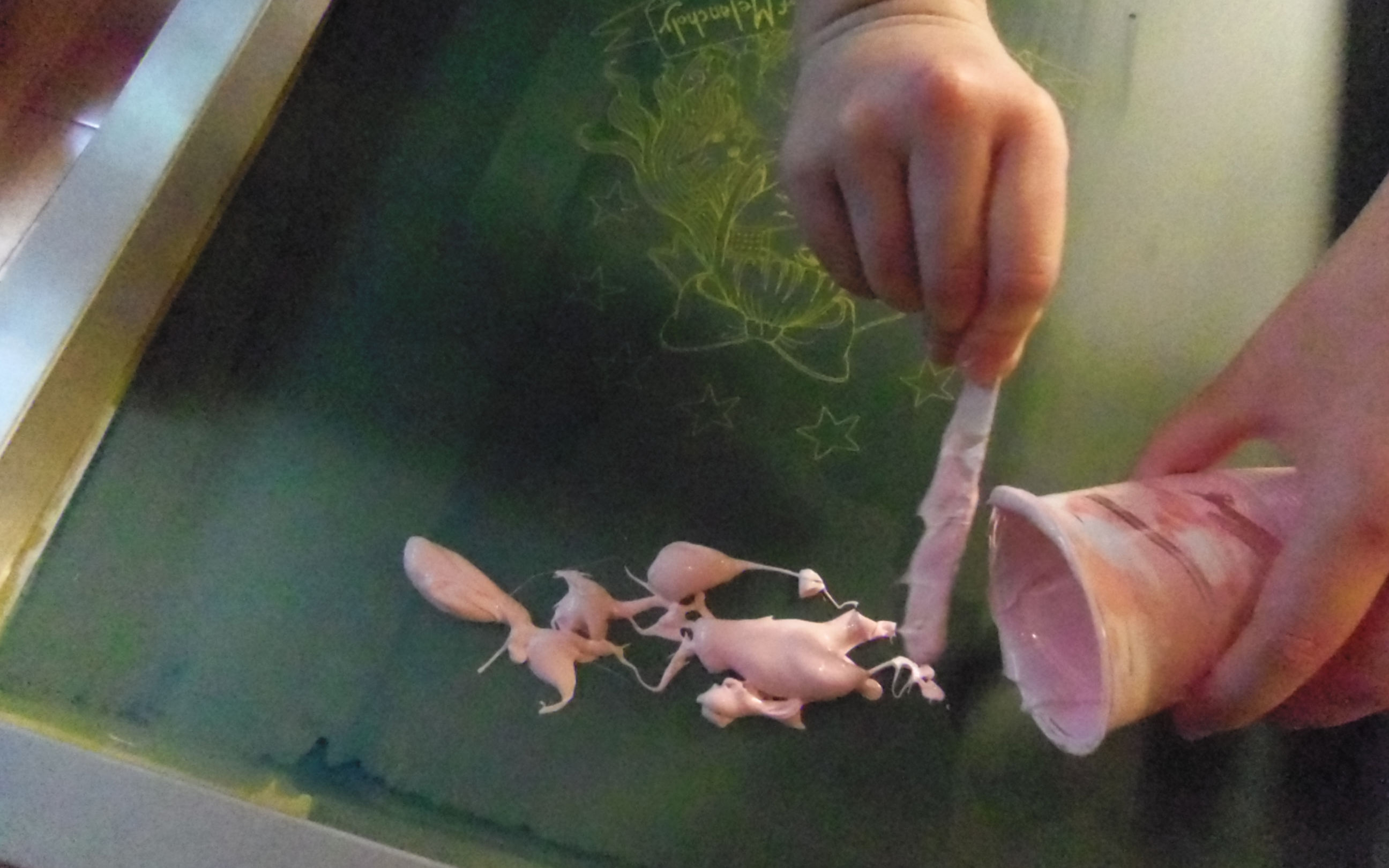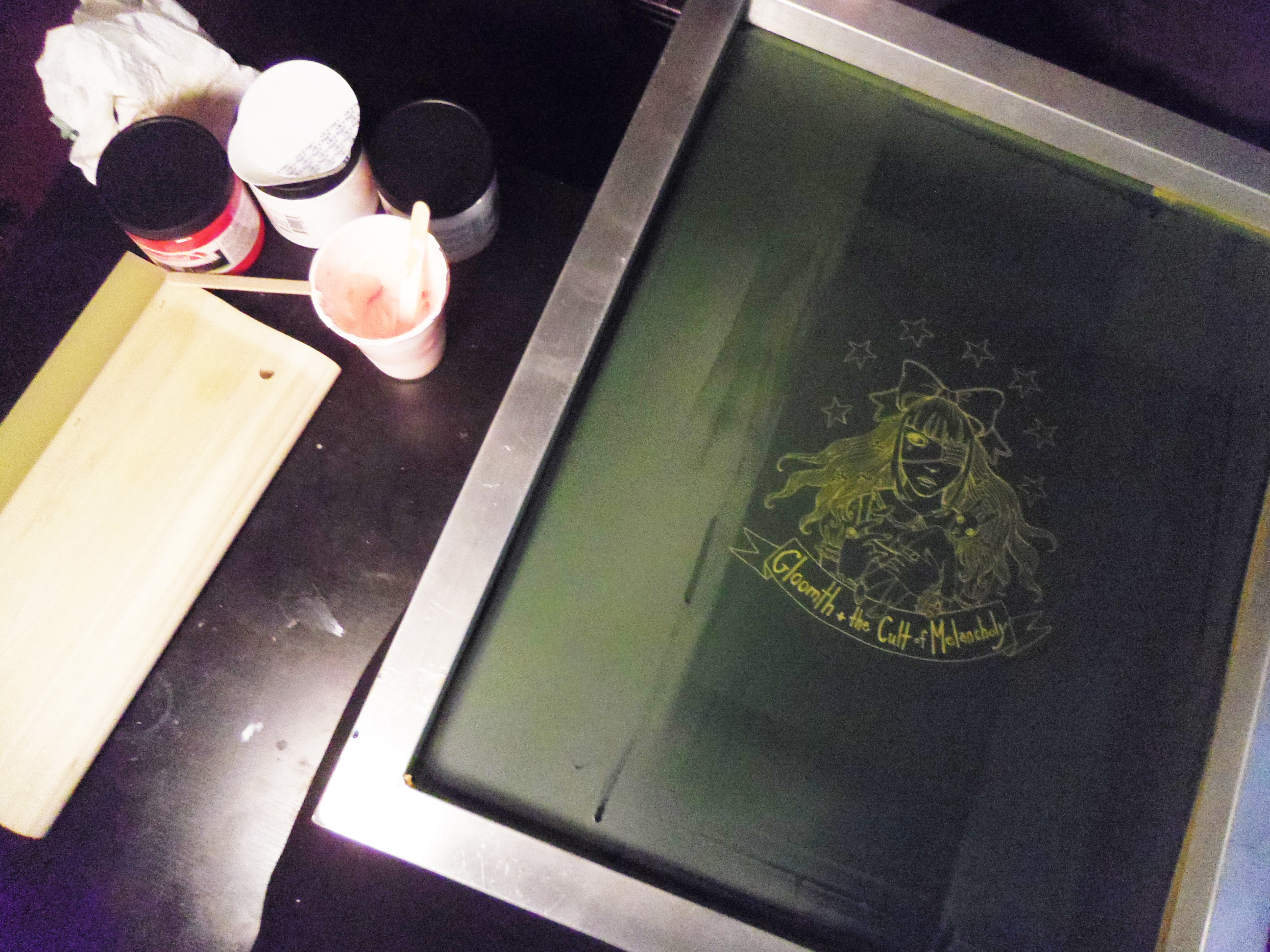 Below are some snaps I took while learning to screen print. You can see the globby ink and first test print there. Several of my cotton pajama tops now have Gloomth test screen-prints all over them…