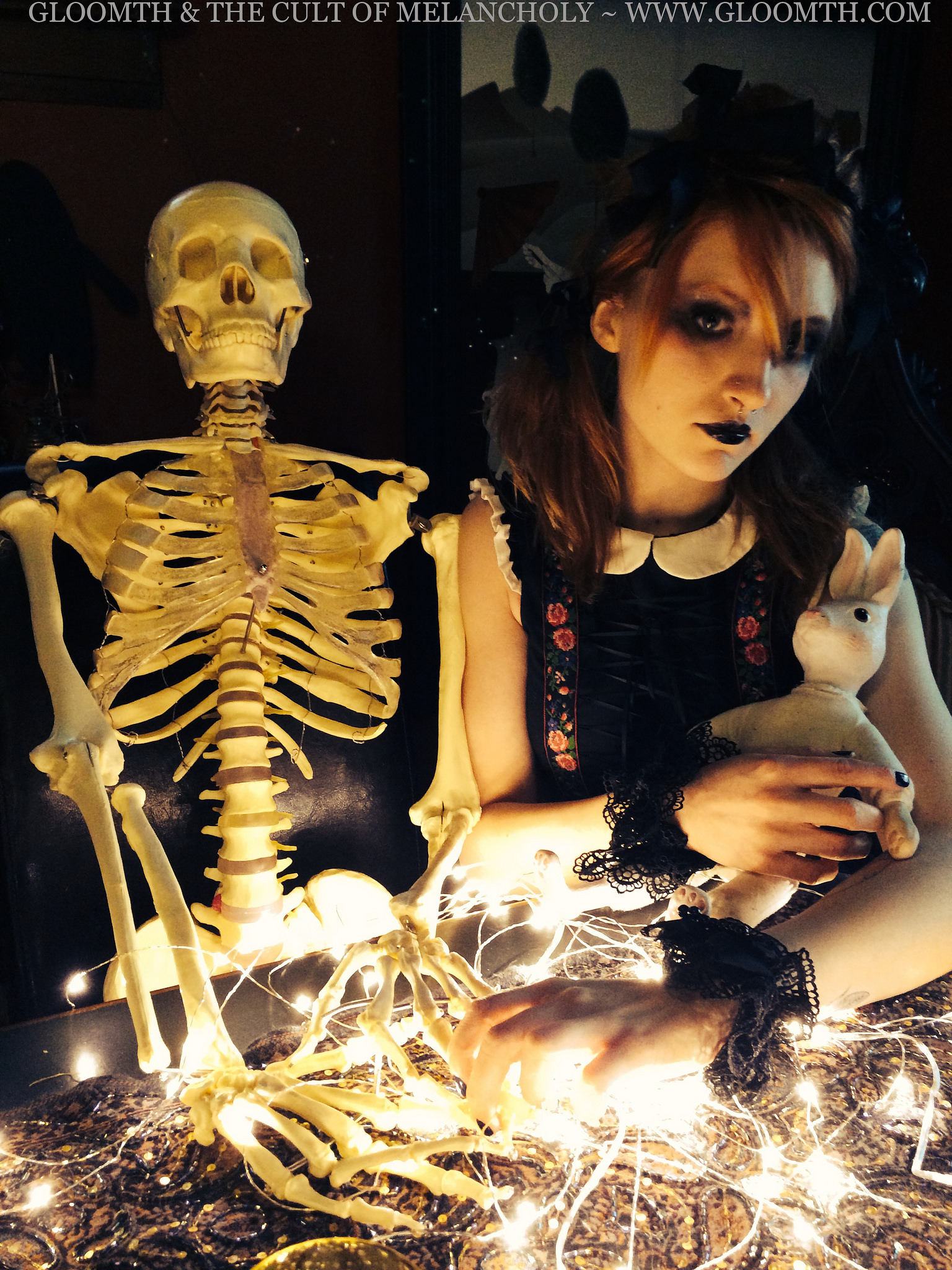 “Morbid Valentine”- Some of us lean more towards mailing our lover a disembodied heart, or at least anatomical hearts drawn on our love notes. Seeing love as a science, a concoction of hormones speeding us to reproduction and decay. Our “Skeleton Valentine” shoot with the House of Pomegranates and Gloomth Girl Syringe is a morbid take on love. It features our “Folk” dress!