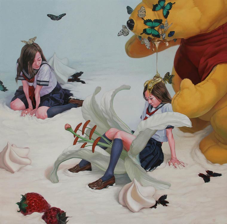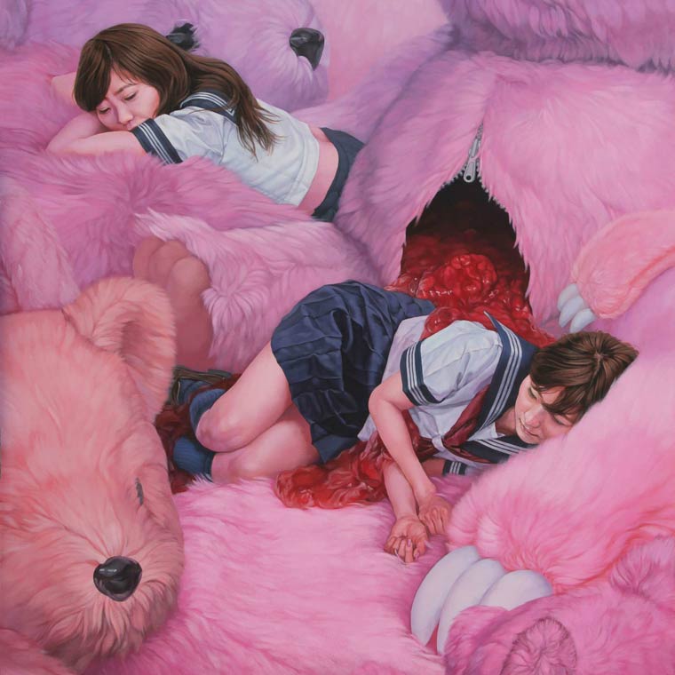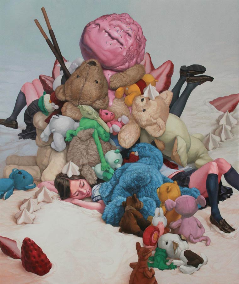 Uniformed schoolgirls drowning in icing and fighting strange giant toys in an unsettling pale candy wonderland. Japanese artist Kazuhiro Hori is inspiring us on this grey spring day.