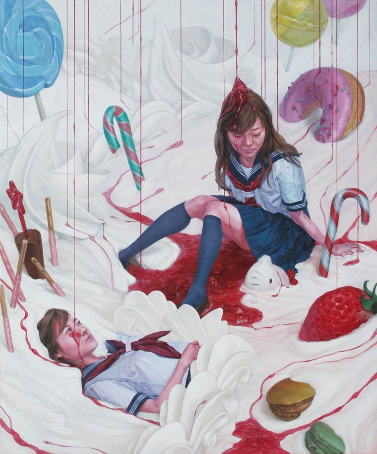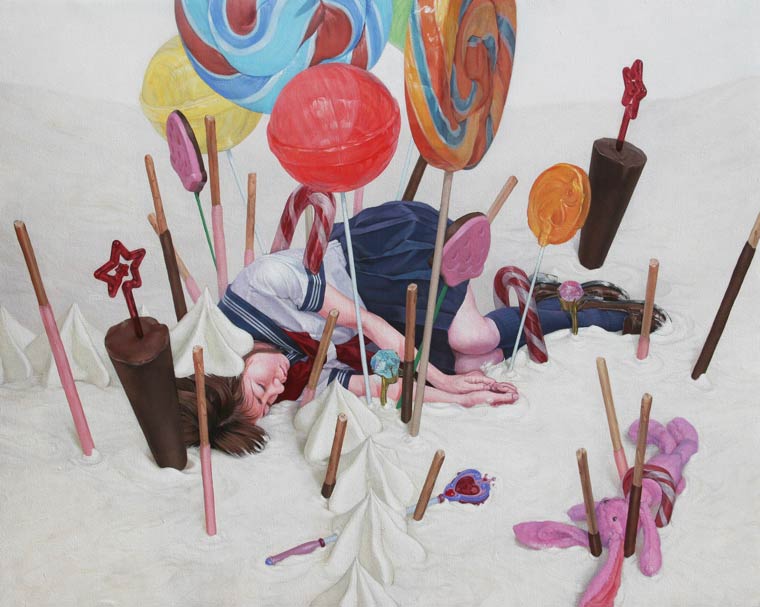 We want to run around the world he has so realistically created and maybe befriend some of the malevolent looking toy monsters. We love the blend of saccharine sweet with the morbid and grotesque. Interspersed with themes of innocence, decay, and suicide his paintings are far deeper than they seem at first glance. The sugary landscape belying the darkness below.