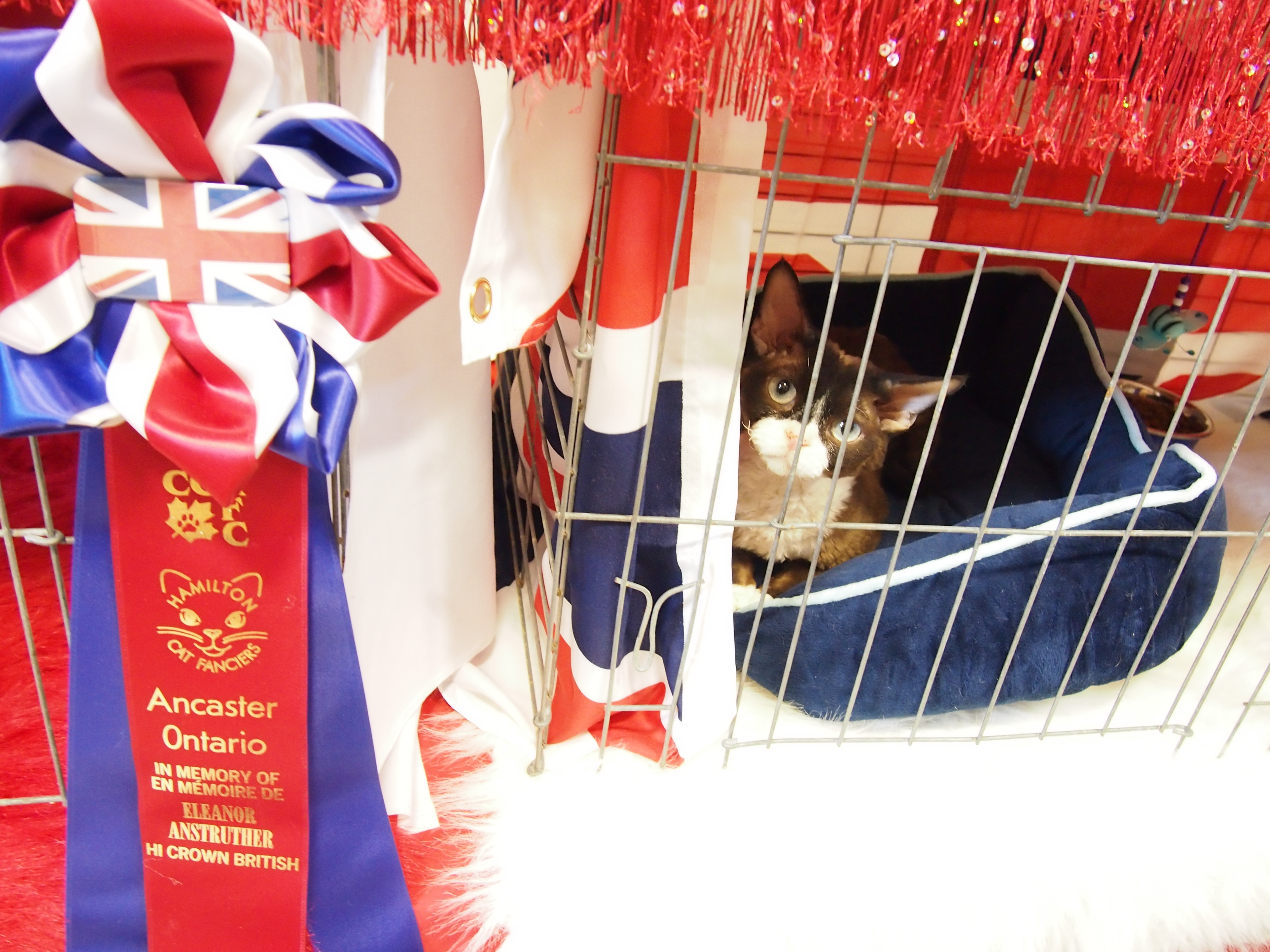 Inside the space were rows of decked out cat carriers, basically little cat hotels plushed out with cushy beds, toys, food, and litter. Some of the carriers were even elaborately decorated to suit the British theme of the show!