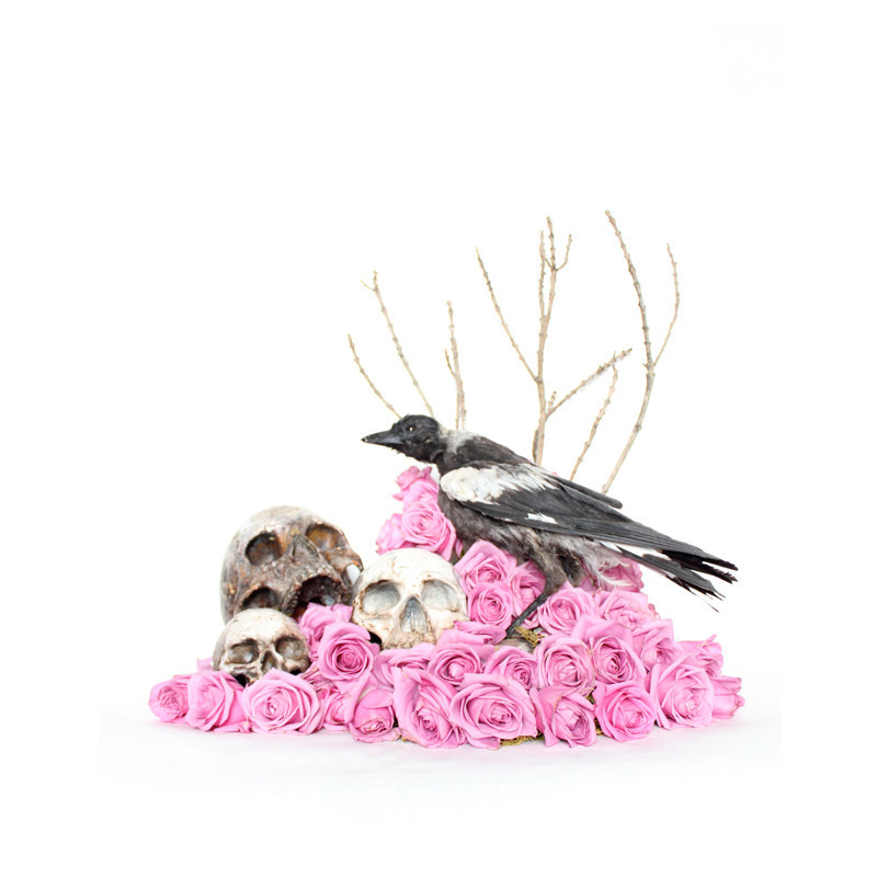 The soft pastel florals almost hide the dark themes in her arrangements. Some of her pieces feature taxidermy birds and preserved skulls mixed with the flowers.