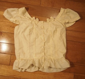 Itoshii Blouse, Small, Bust 34-36″, Waist- 28-29″. $15 Long discontinued. Black cotton with white lace. Missing the ties for the collar and cuffs, though I may be able to find replacements before shipping. Condition is fine, the lighting for the photo makes it look spotty/faded somehow.