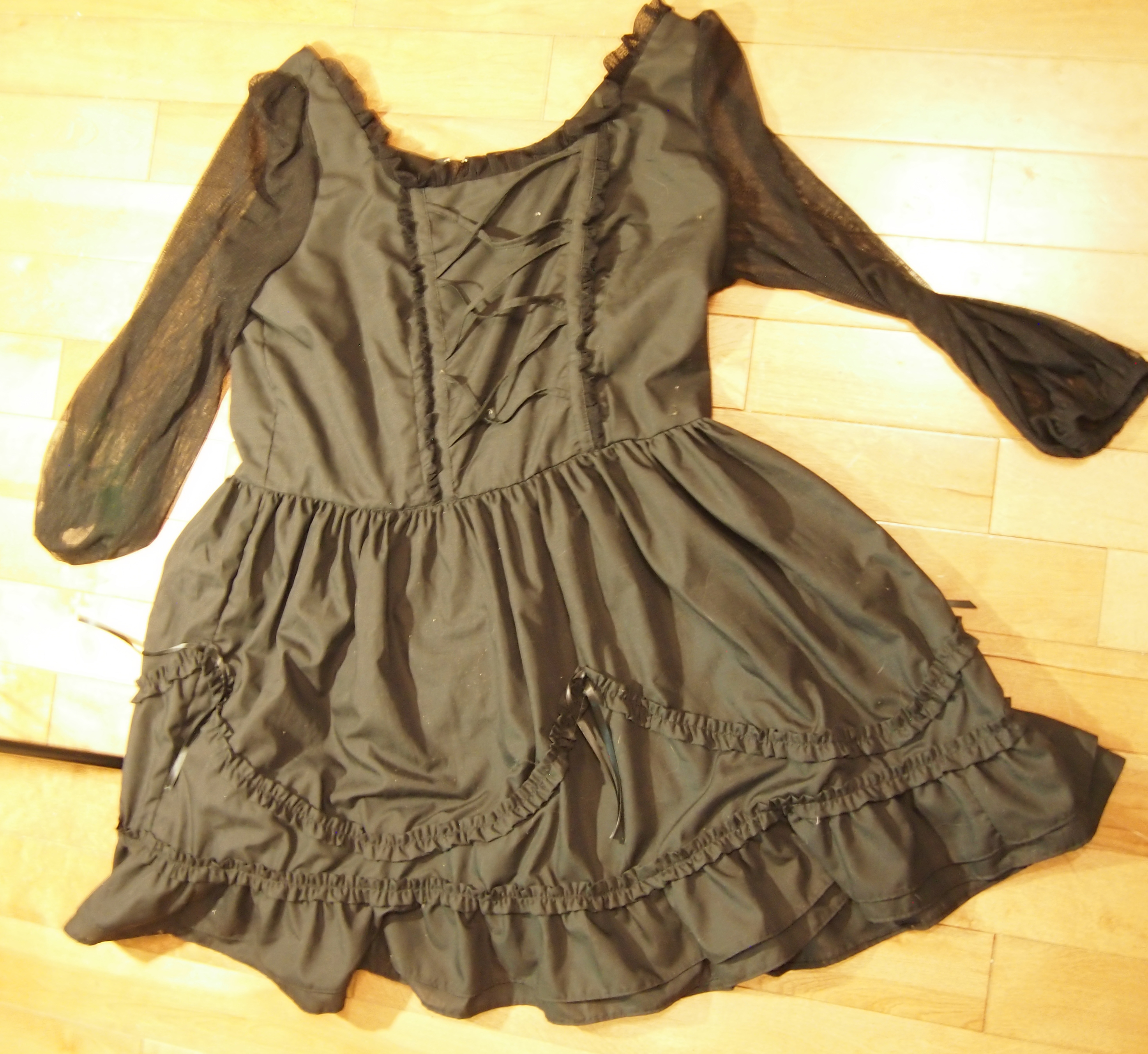 One of a Kind Black Dress- 1XL $70. (Sooo much cuter than this terrible photo makes it seem). Based on our “Alouette” dress this dress features corset lacing details and long sleeves in a black dot mesh (stretchy). Bust 43″, waist 39″. SOLD