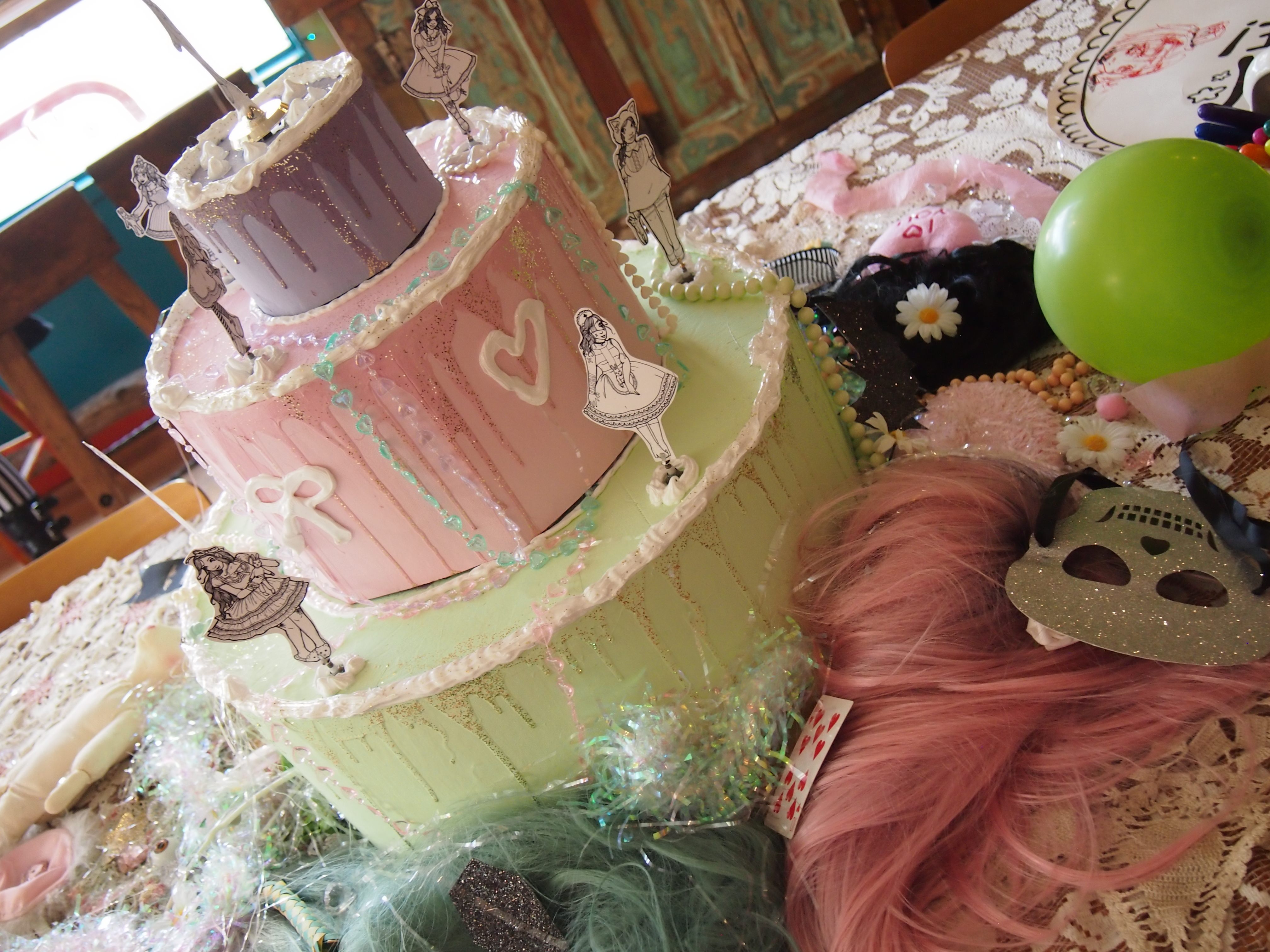 The “Gloomth Misfit Devil’s Food Cake” was inspired by the nostalgia for childhood birthday parties and aposematism (when a creature has garish bright colors to warn predators of its poisonous nature). It’s made of toxic ingredients! The theme for our recent Tea Party was linked to our spring line “Black Licorice” so we incorporated lots of pastels and dripping strange elements. The cake fit right in! 😉