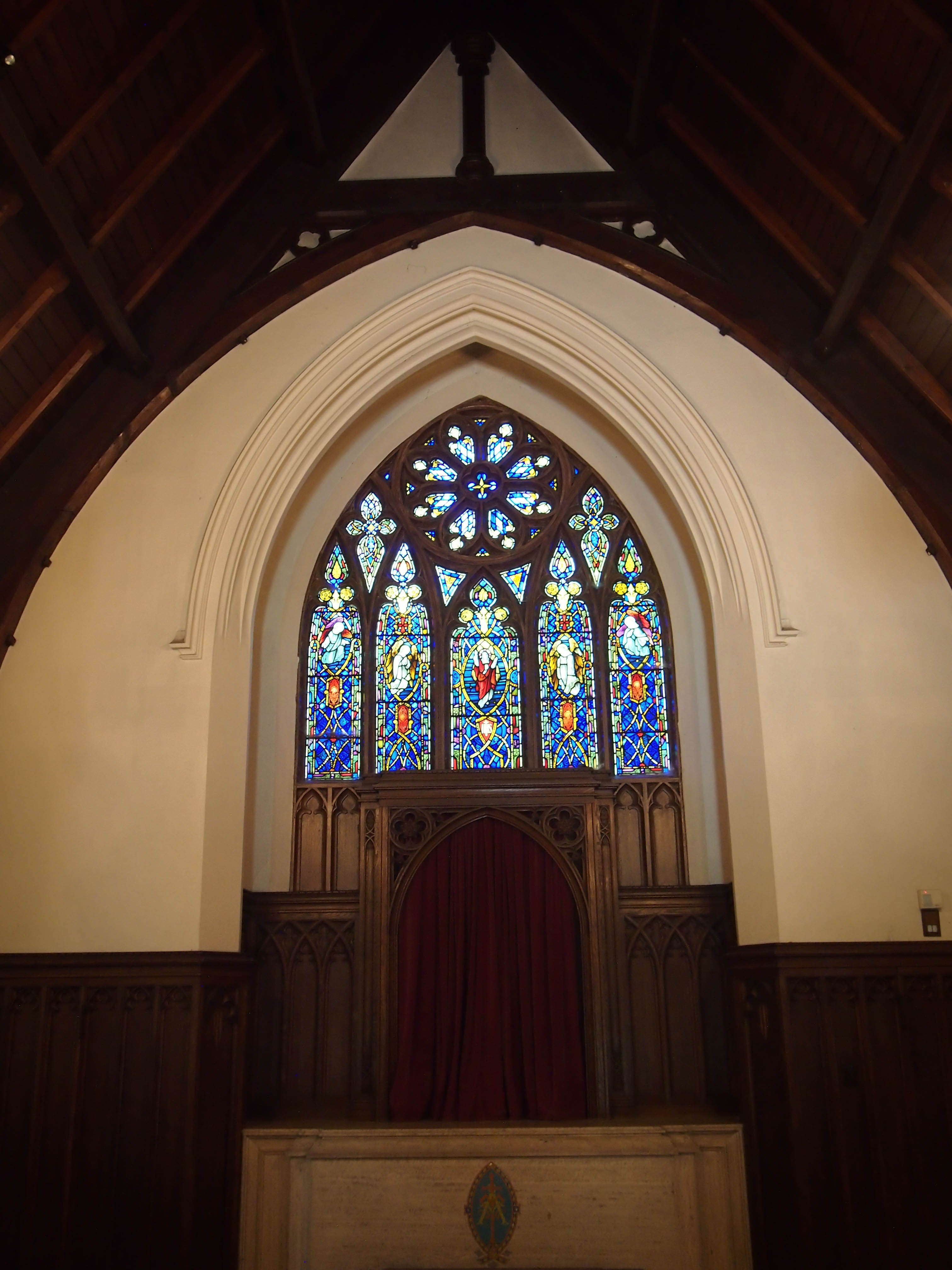 The gates are beautiful carved wood in the style of High Victorian Gothic, vines cascade over the stone of the tiny chapel at the entrance. Inside the chapel is a small space for funeral services and engraved memorial markers. The stained glass window fills the room with a warm glow.