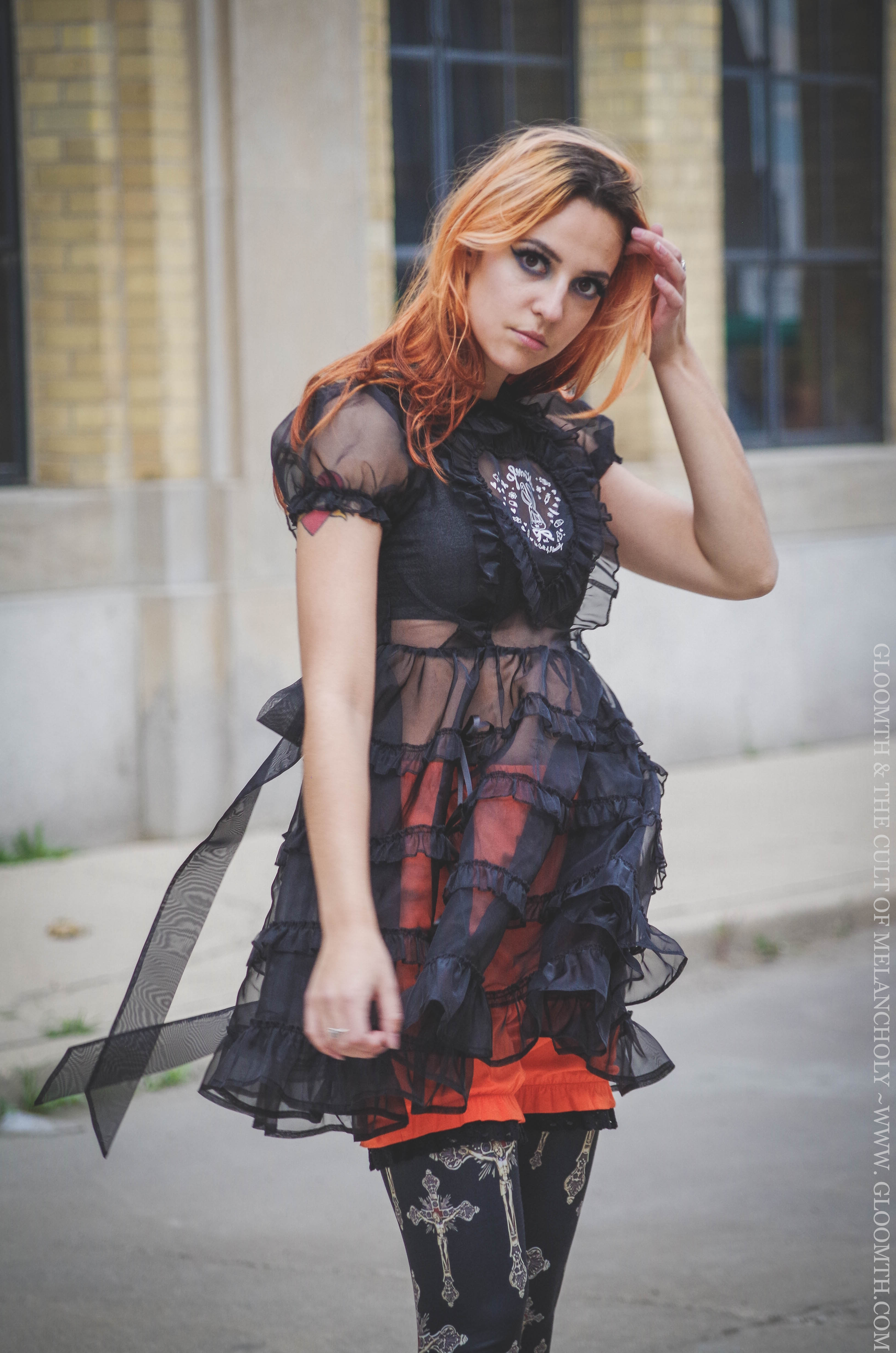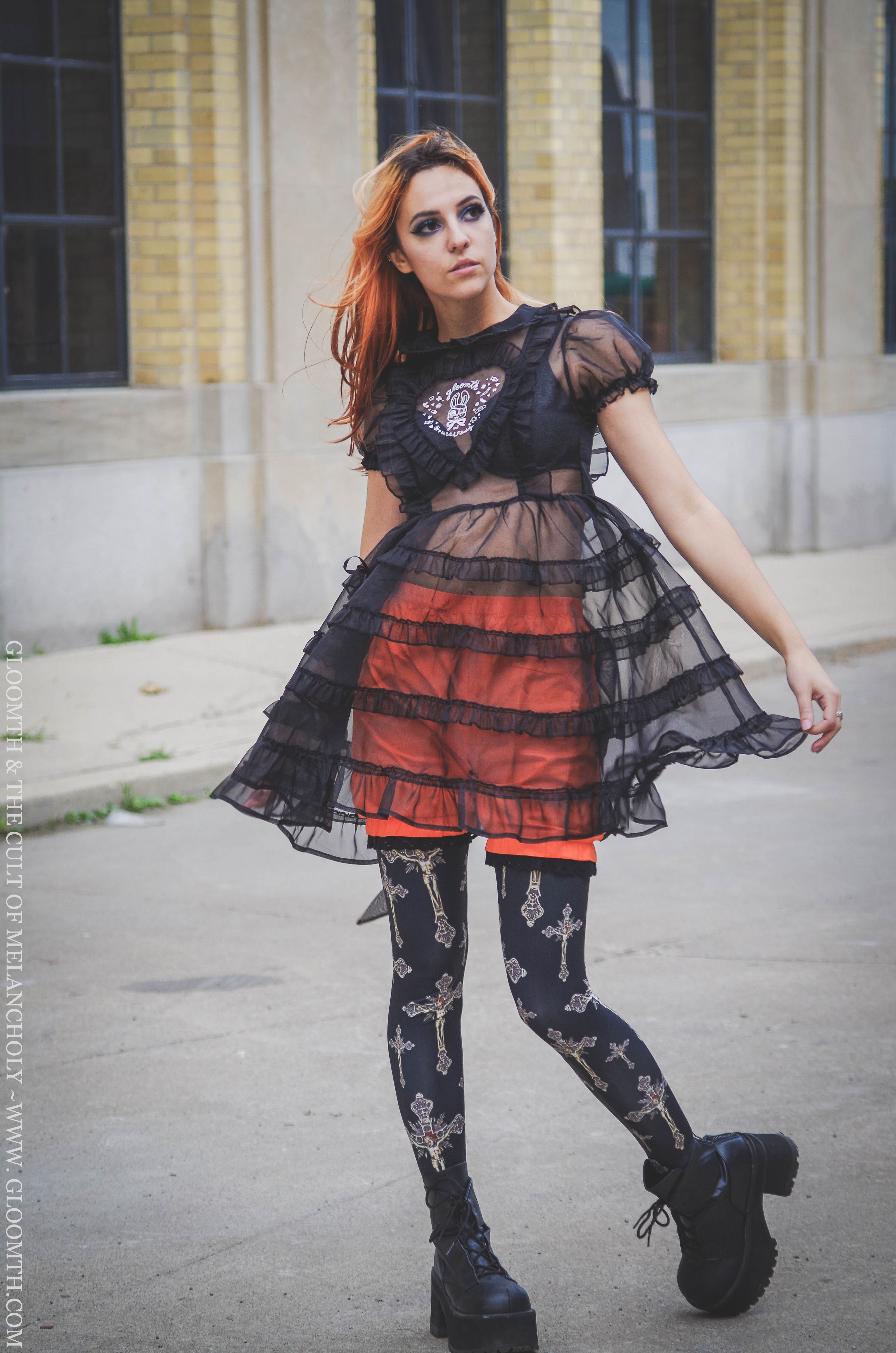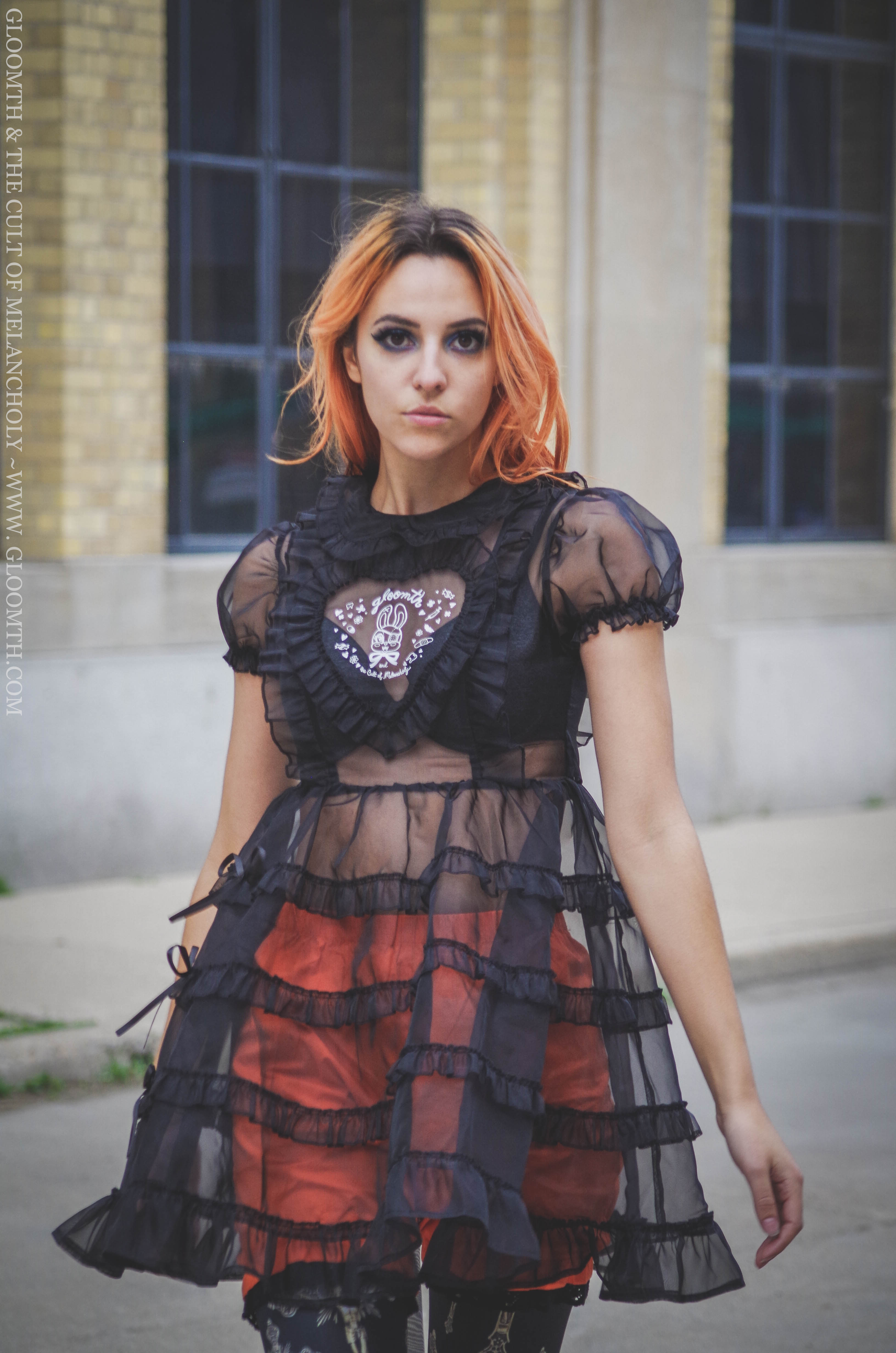 I am really excited about this dress. I have been wanting to create a sheer dress for Gloomth for a very long time and until now it felt like it didn’t really fit in with our other styles. My design policy has always been to trust my instincts and design things I wanted, rather than try to fit into narrow subculture definitions or please some specific audience- and this dress is 100% pure me. Sheer, frilly, ridiculous, and fun! I don’t know why I let silly doubts hold me back from creating it for so long.