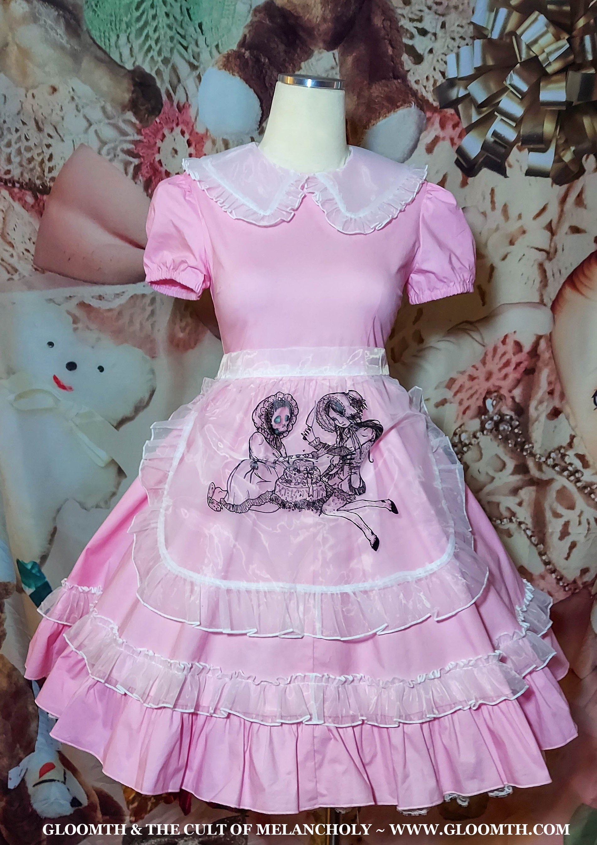 Our new limited edition “Blush” pink Maid outfit is a very Gloomth blend of creepy and cute! It features original artwork by Taeden Hall (um, me) on the apron in detailed black printing. Sheer organza collar, ruffles, and removable apron! It also has pockets!!!
