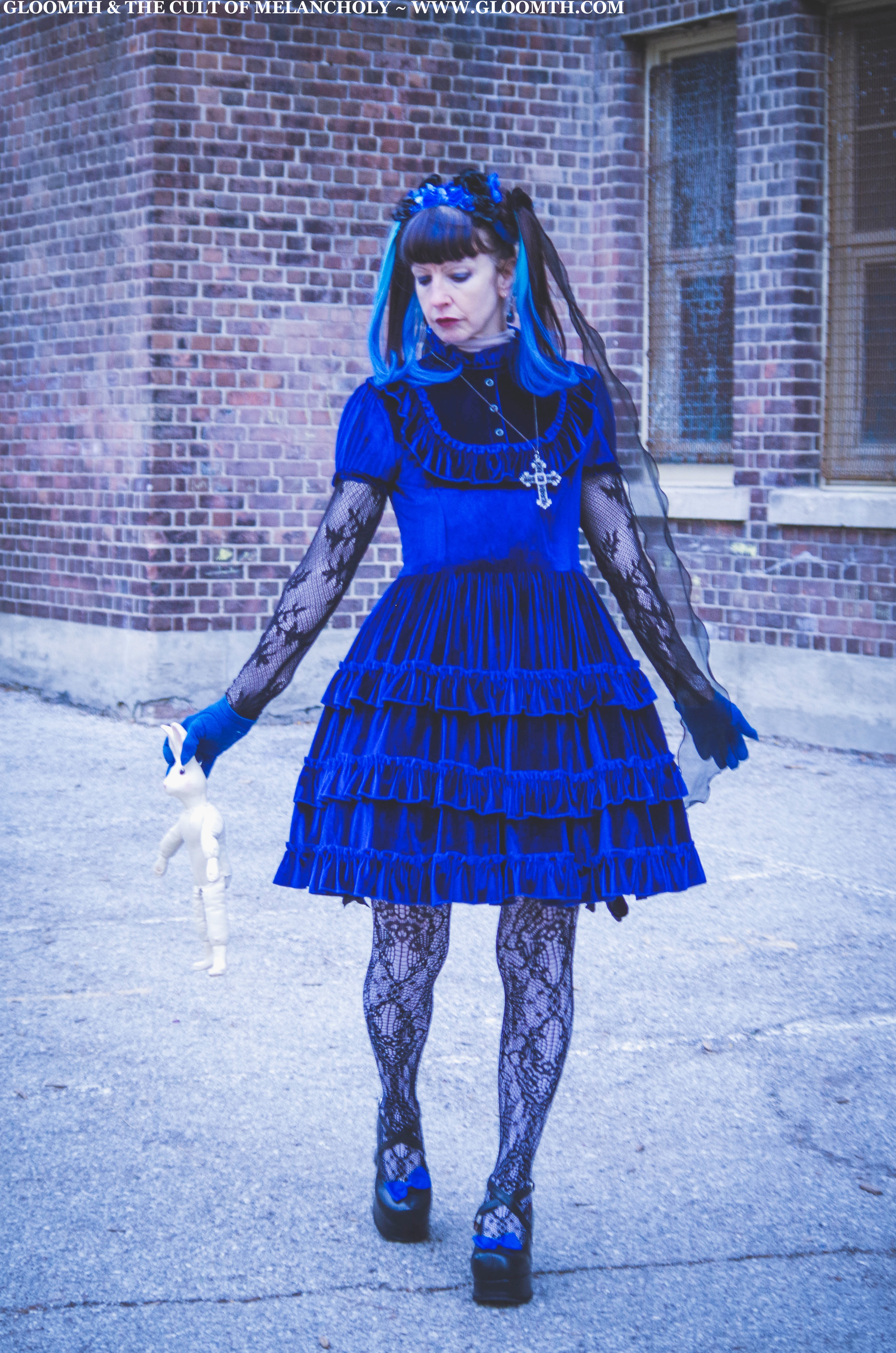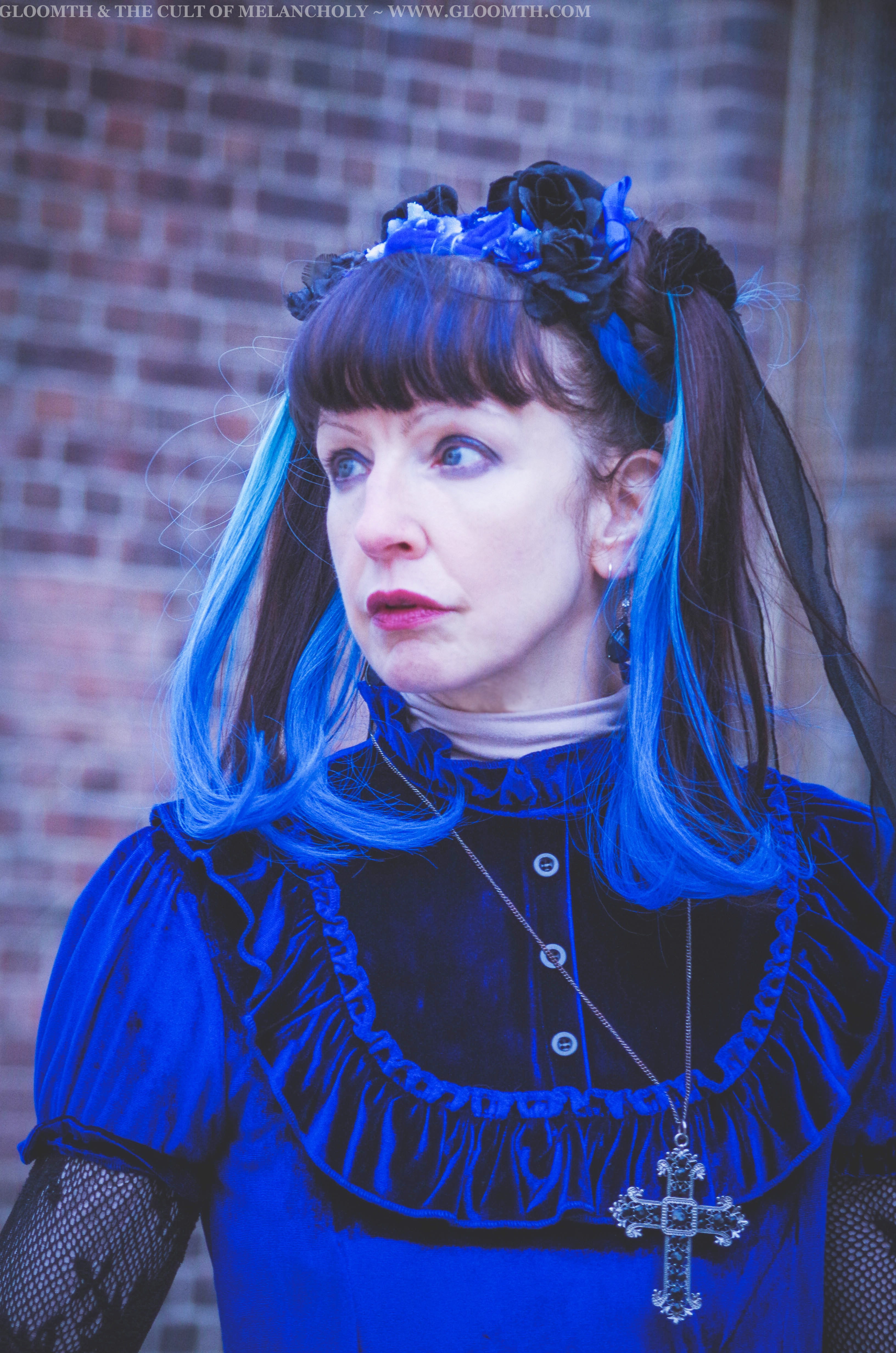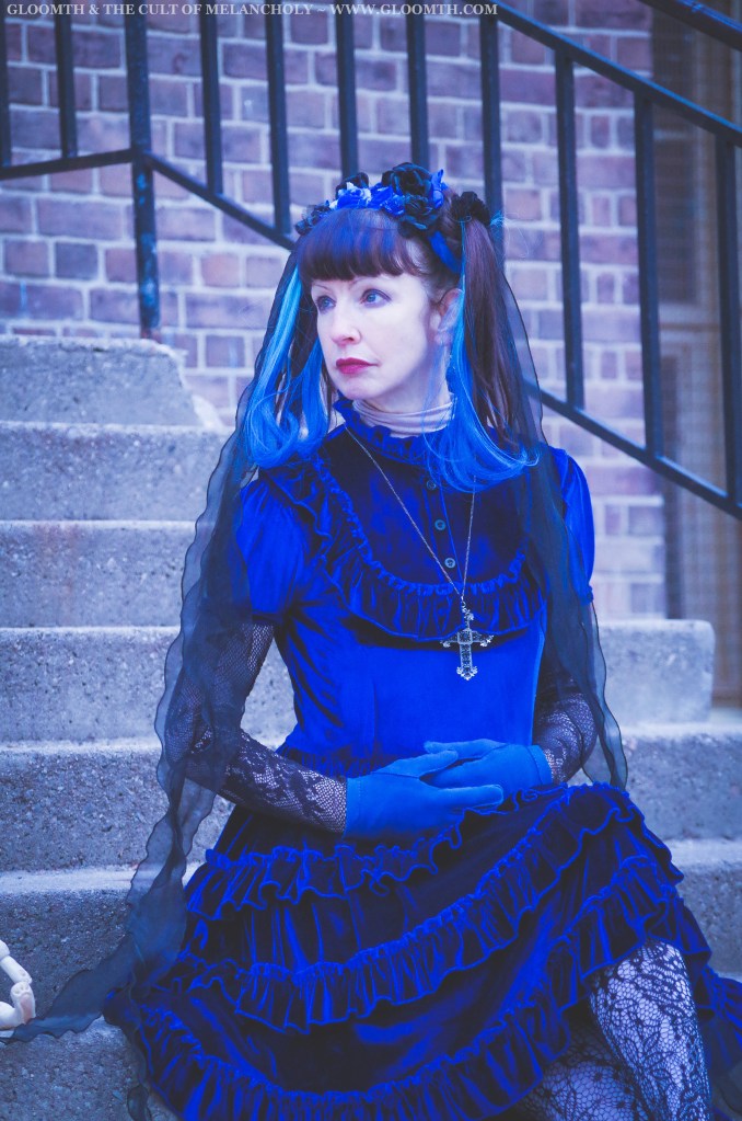 For my final shoot last week I shot some casual photos of my friend Karen in our Dauphine dress! She paired it with some traditional gothic lolita accessories and lots of shimmering blue jewelry.