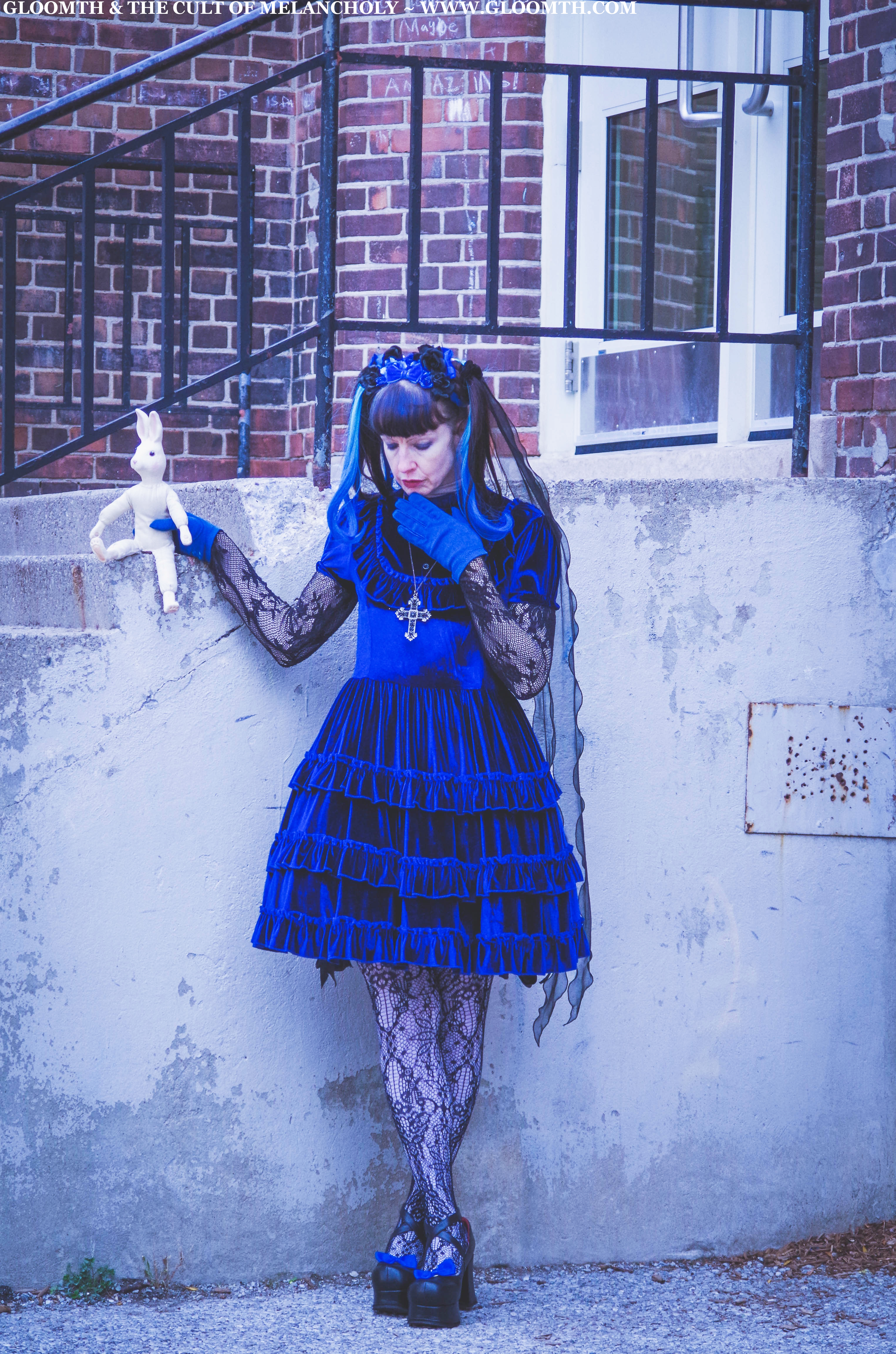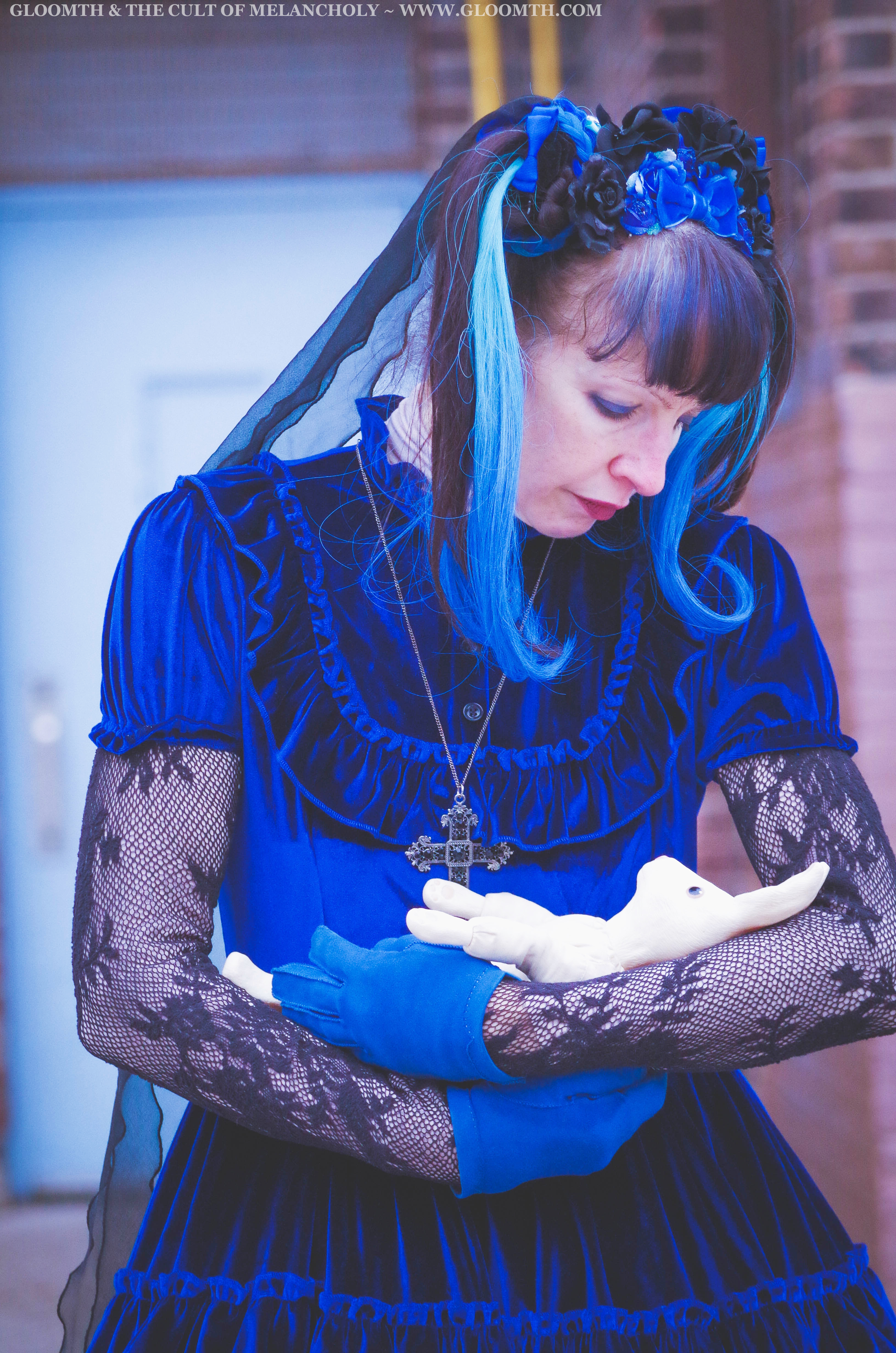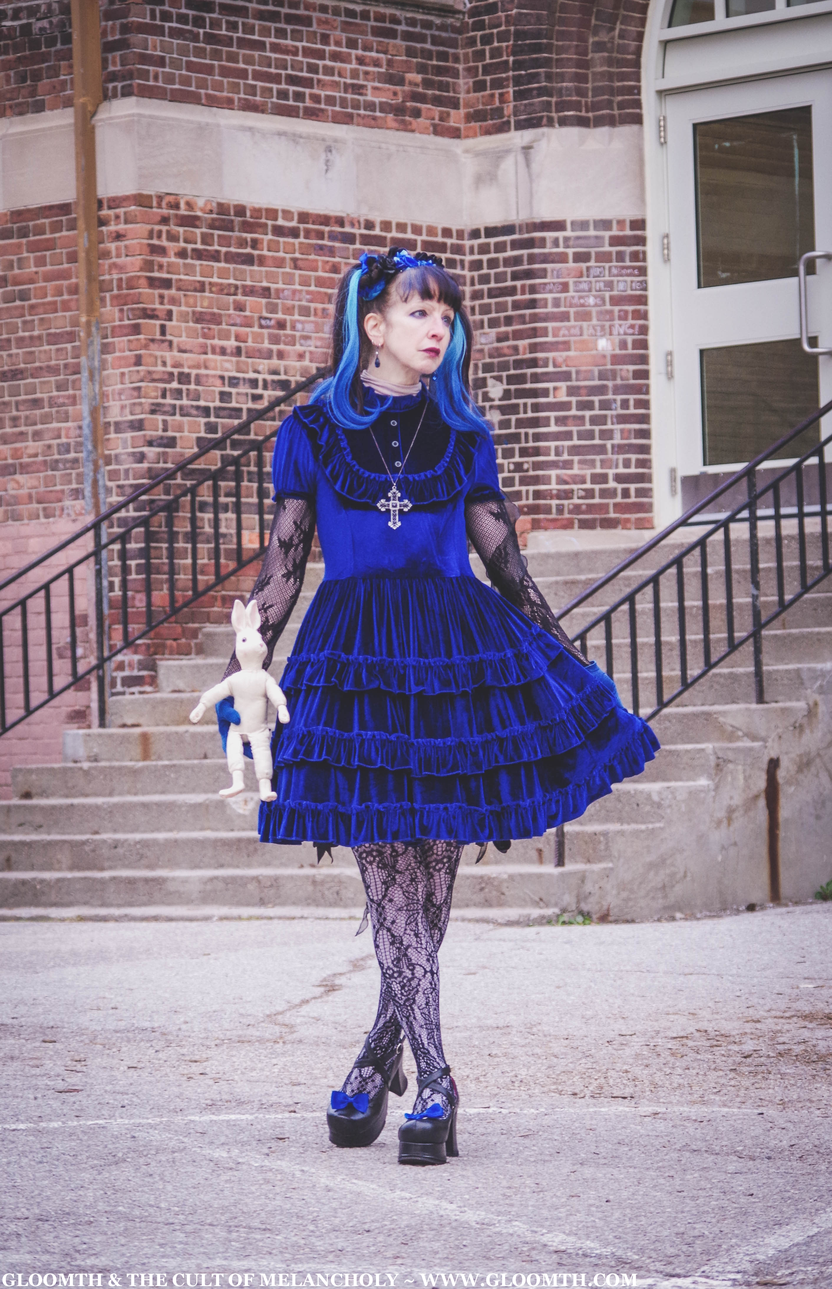 For my final shoot last week I shot some casual photos of my friend Karen in our Dauphine dress! She paired it with some traditional gothic lolita accessories and lots of shimmering blue jewelry.
