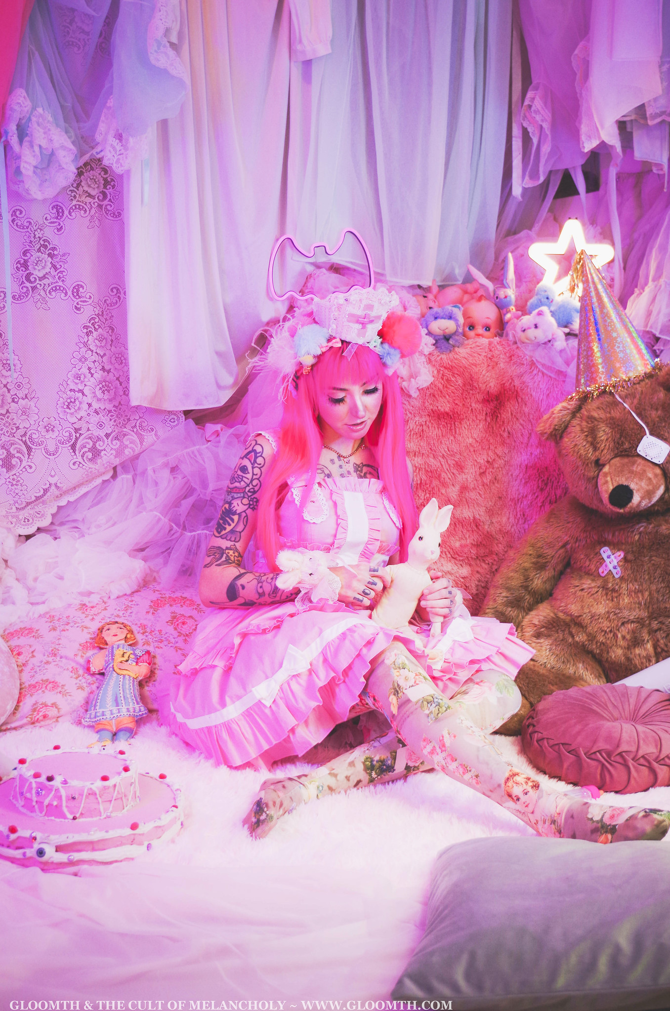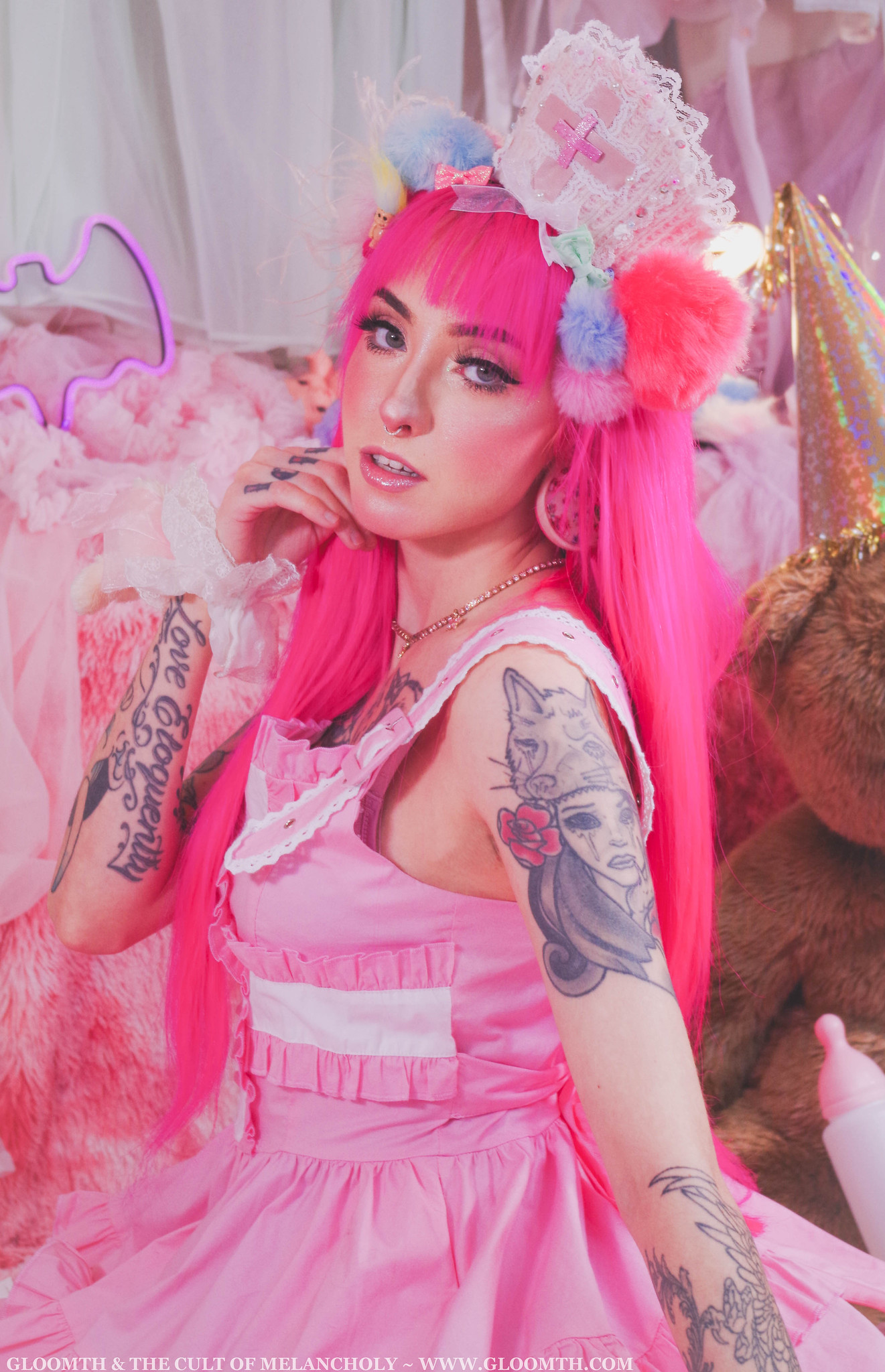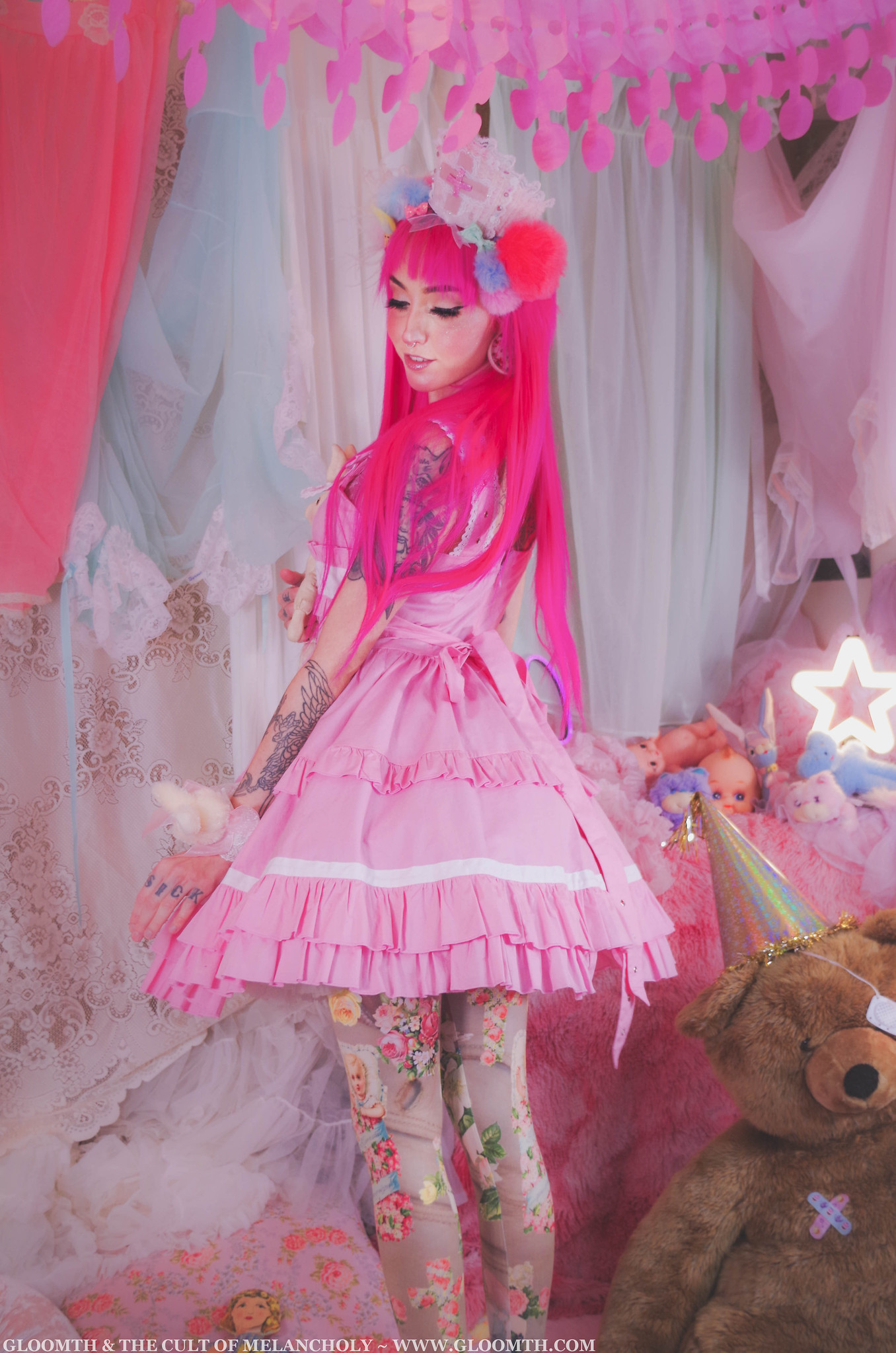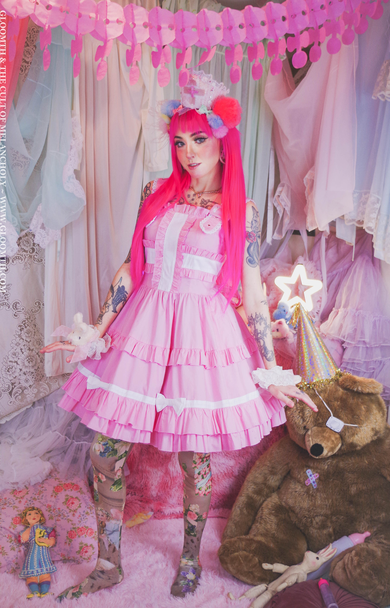 Lucy wore our “Medicine” dress for these shots paired with our “Cherubs and Crosses” print tights. With her bright pink hair she looks like a kawaii dream! I’m so glad we got to make art together again, hopefully we’ll be able to create more next year.