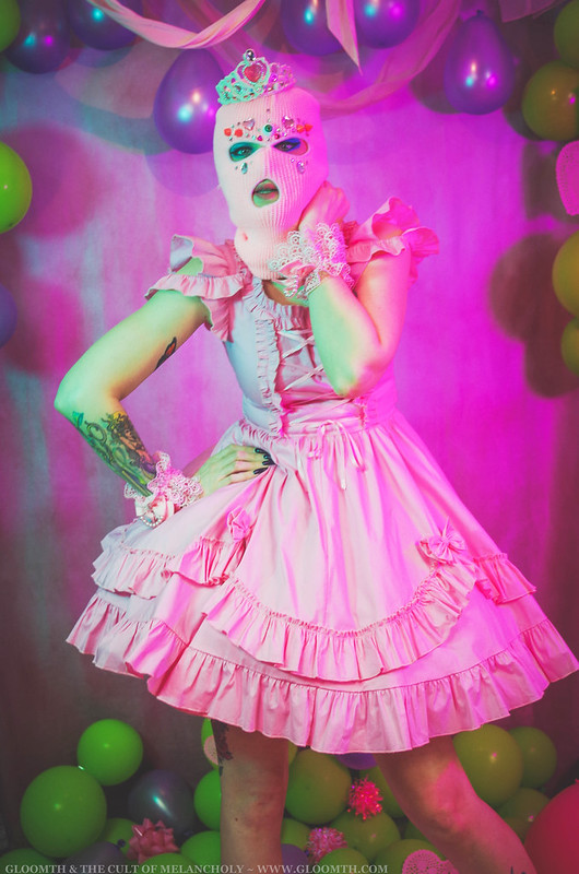 Fine Lines modeled it for me in this fun creepy kawaii shoot filled with neon green balloons and weird accessories I made. This dress is available on the Gloomth site in sizes S-5X. It has removable arm sashes and tons of fun details to make it unique!