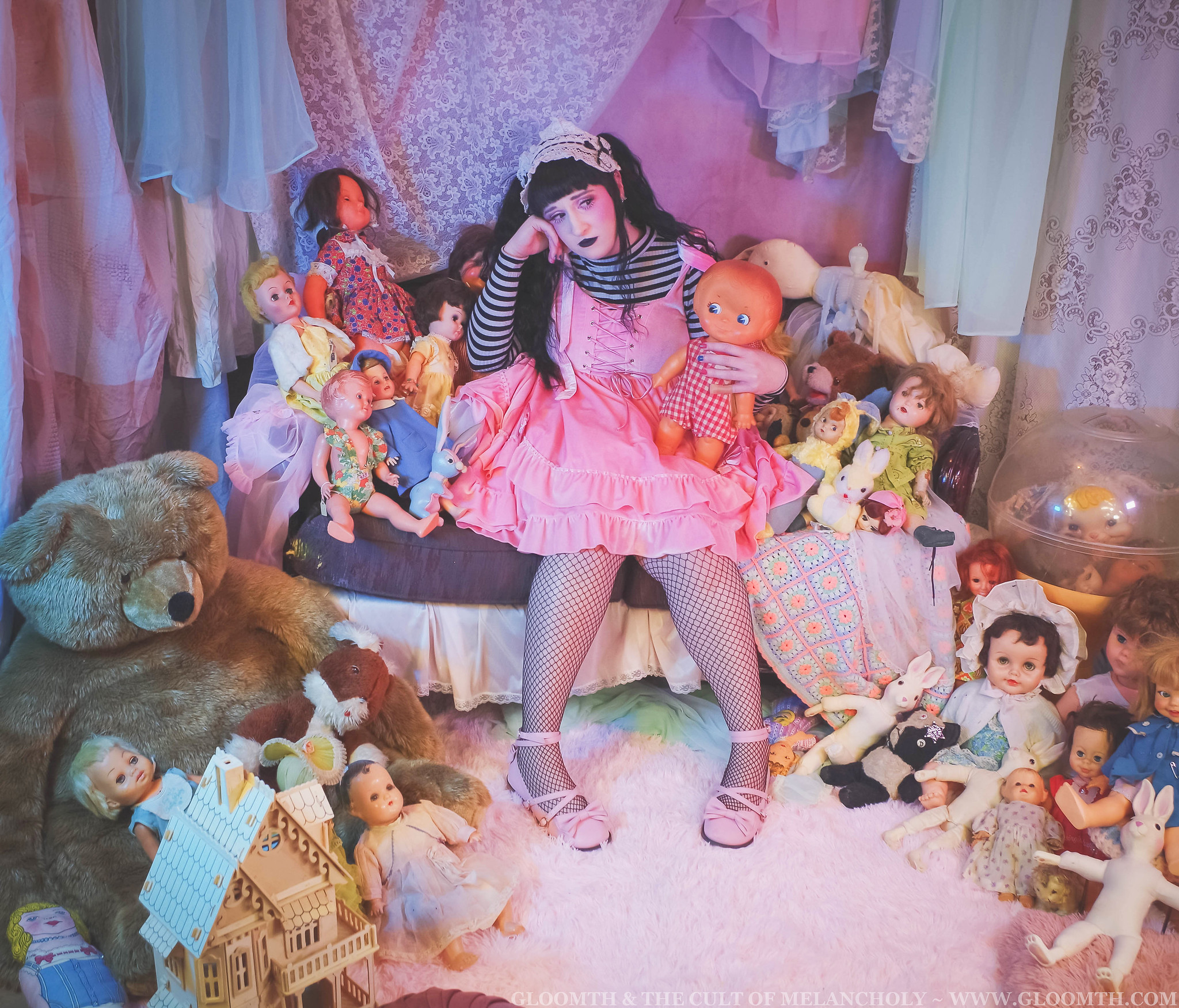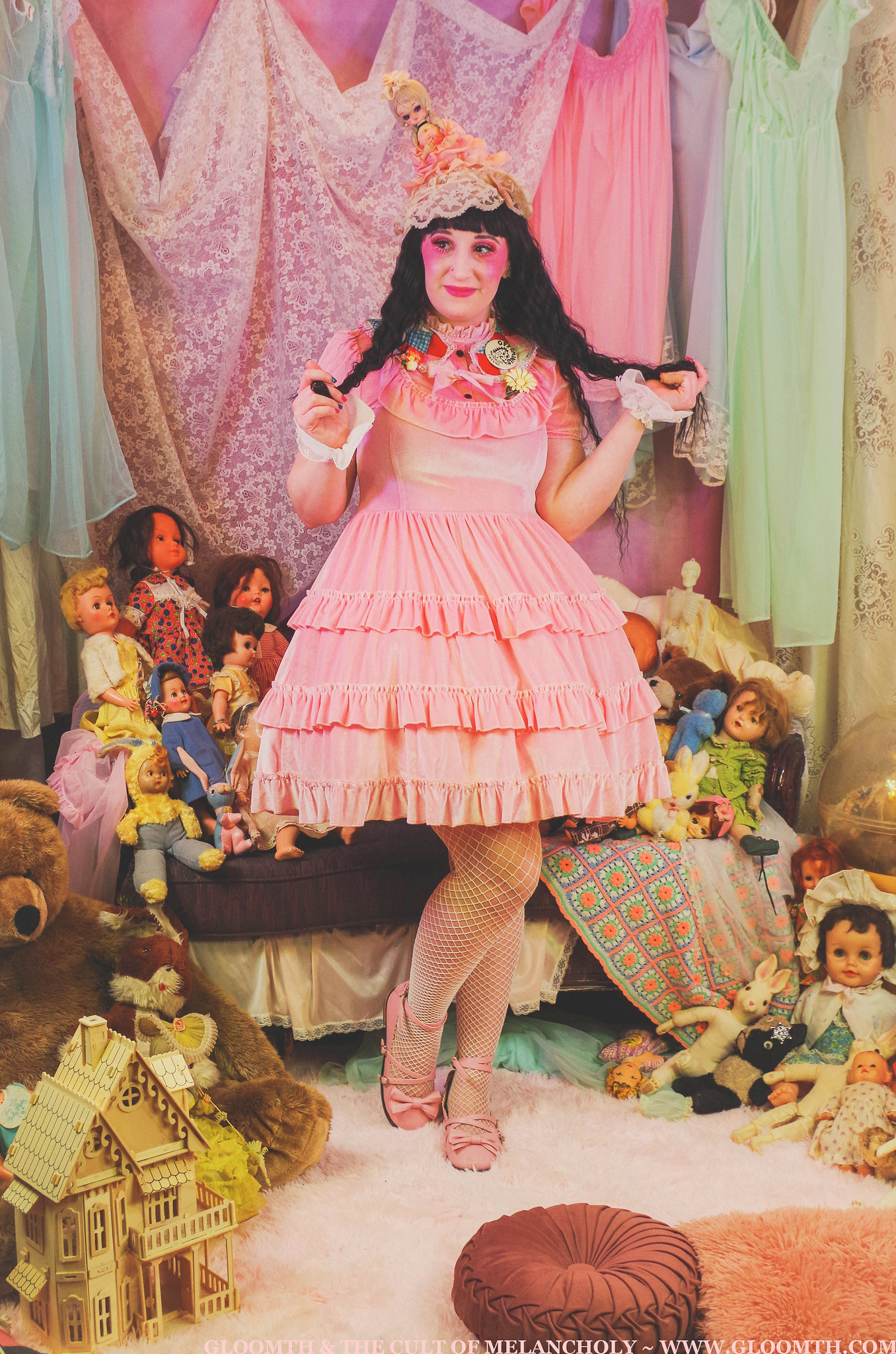 Lor coordinated our new velvet jsk’s with a stripey top and fishnets, it’s a different take on traditional lolita styling and I love it! The set I built for this shoot is filled with some of my vintage toys and housecoats.