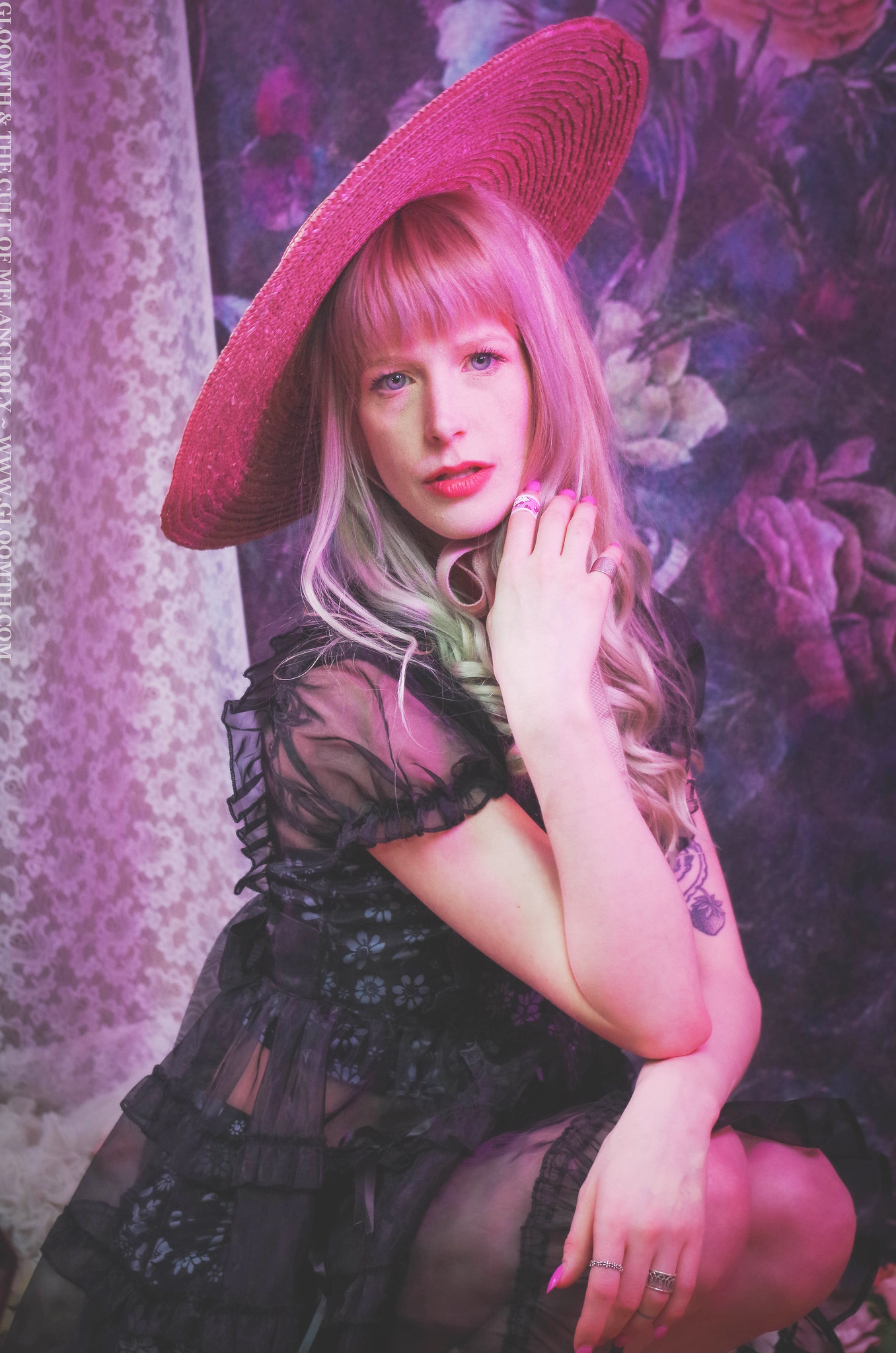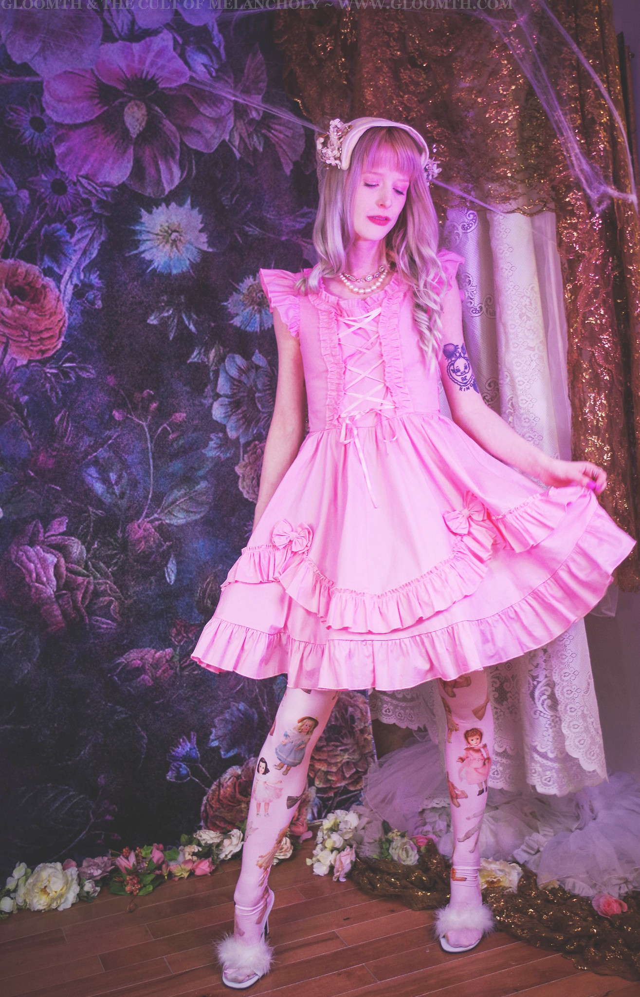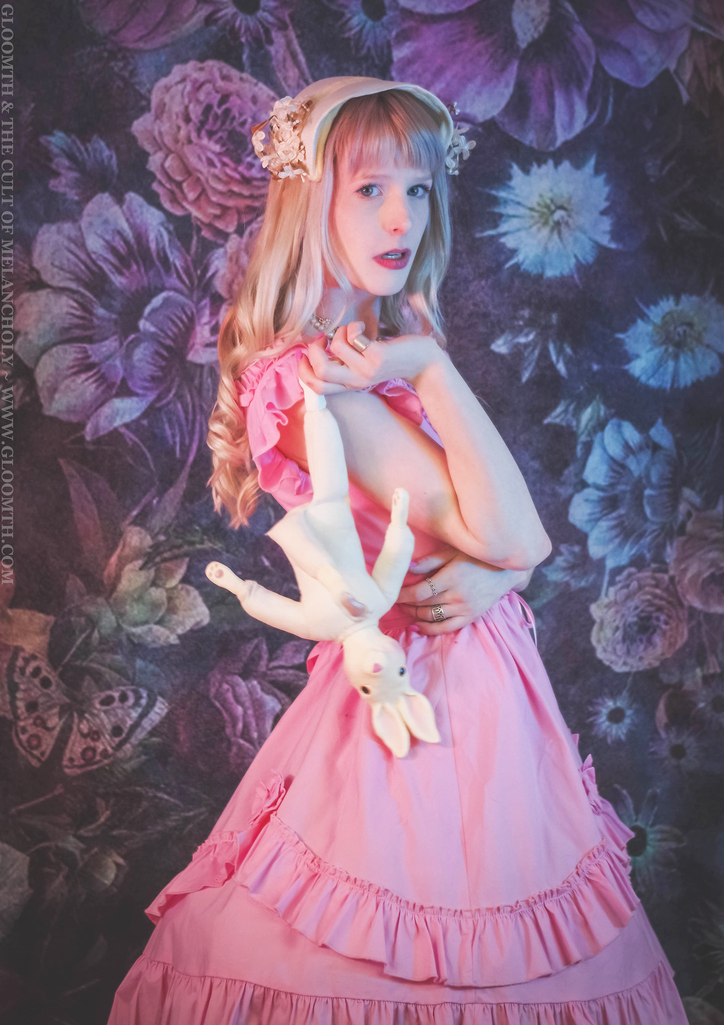 Vile Gloom wore an array of our newer designs paired with soft ribbons, pointe shoes, and flowers- all against a moody violet backdrop filled with flowers and lace and spiderwebs. This shoot has a delicate vintage vibe that is just so perfectly early spring!