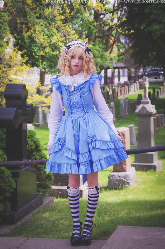Yasmine wore our “Alice’s Pool of Tears” jsk over her own blouse and paired with stripe socks for an old school lolita take on an Alice look!