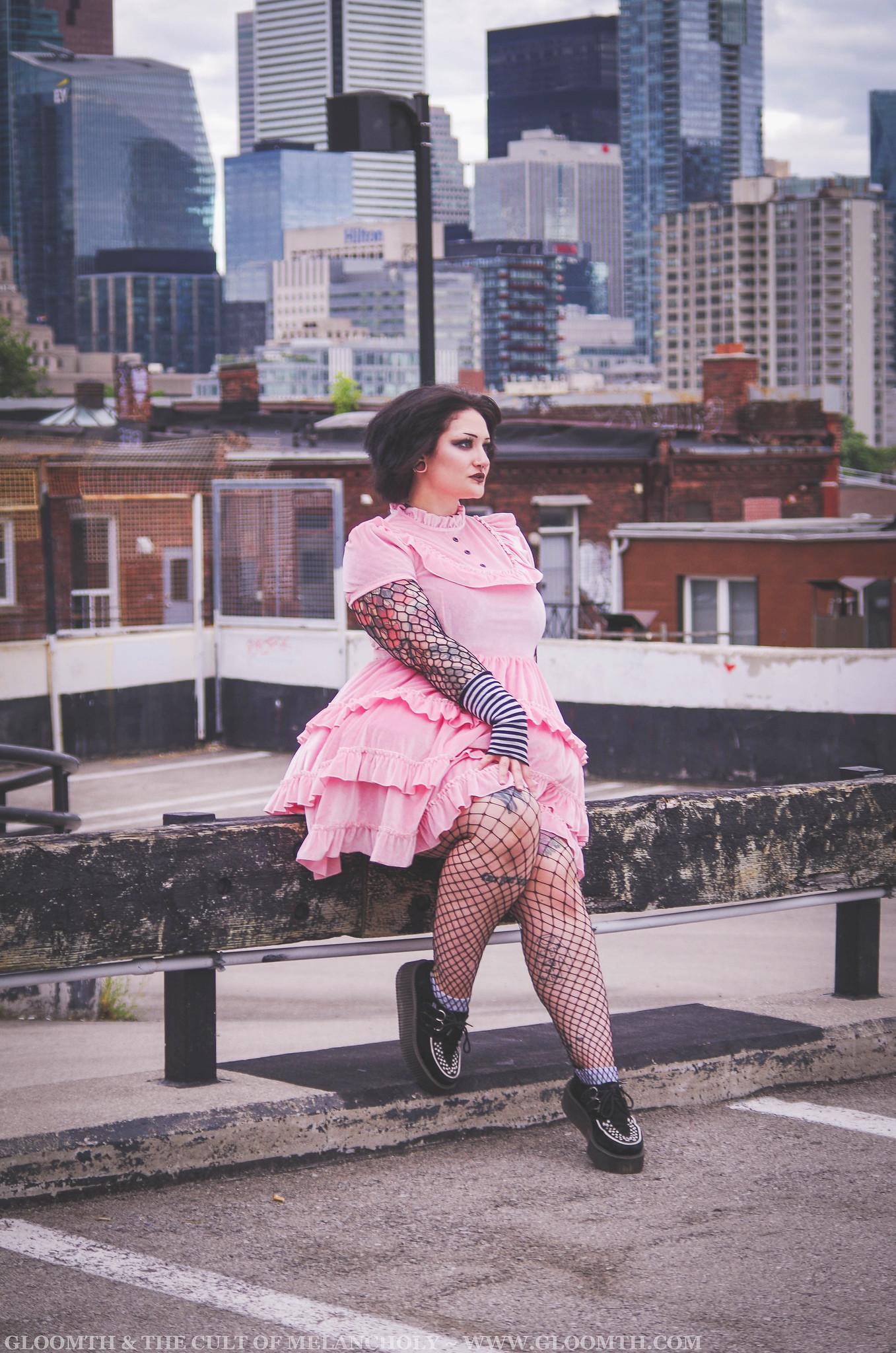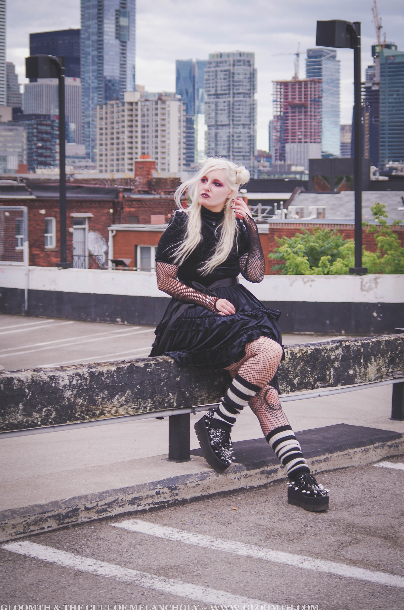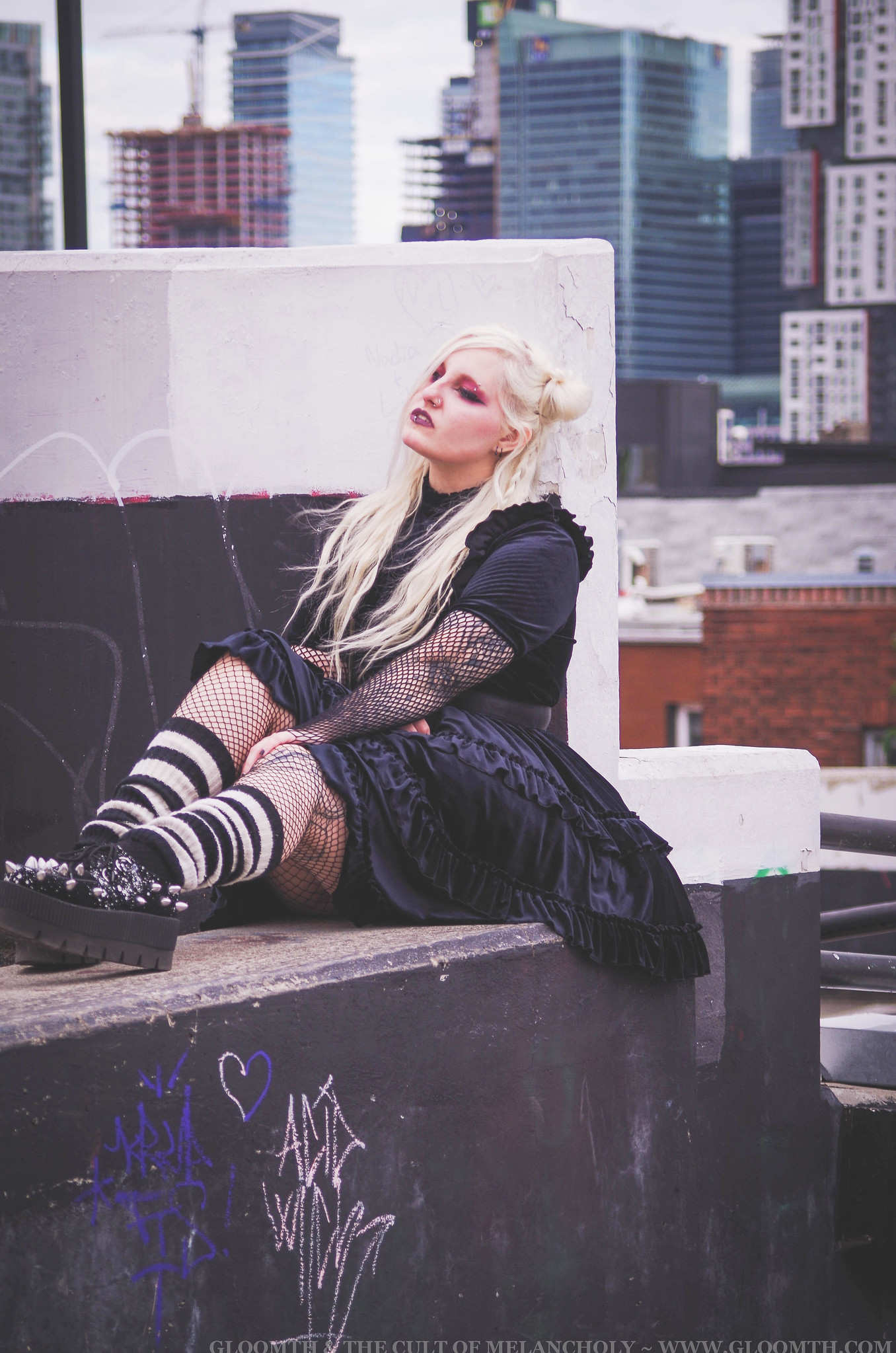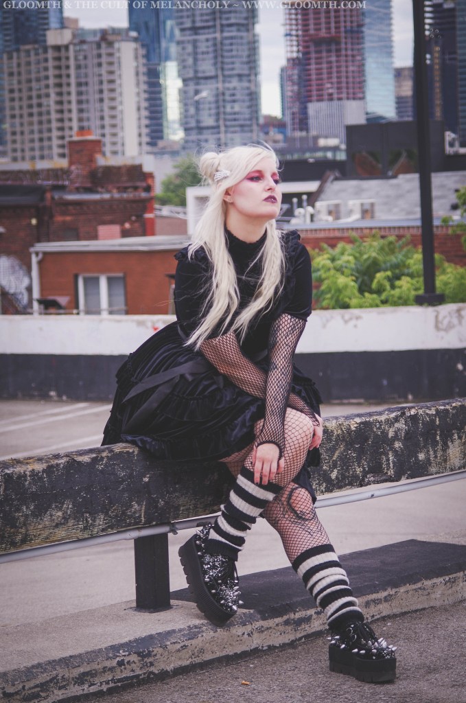 Both Lucy and Azura wore our velvet dresses (October and Cupid designs) coordinated with stripey accessories and fishnets for a sort of 2007 emo fashion vibe.